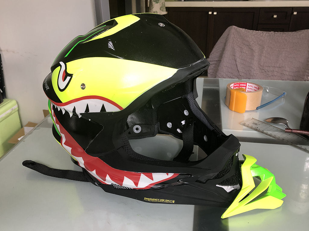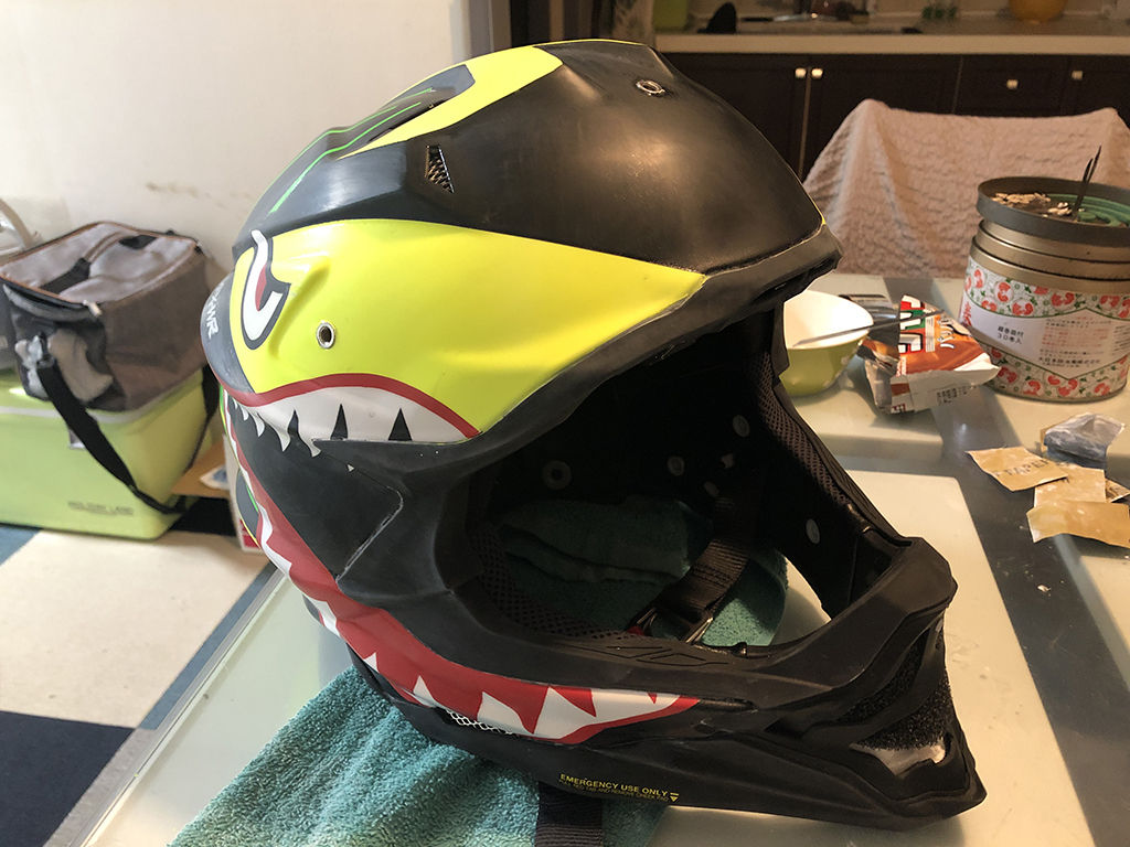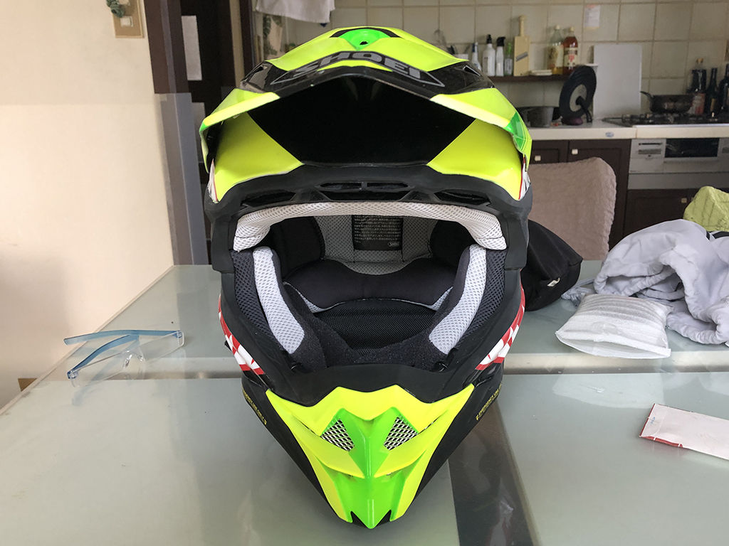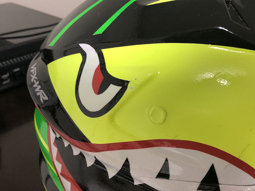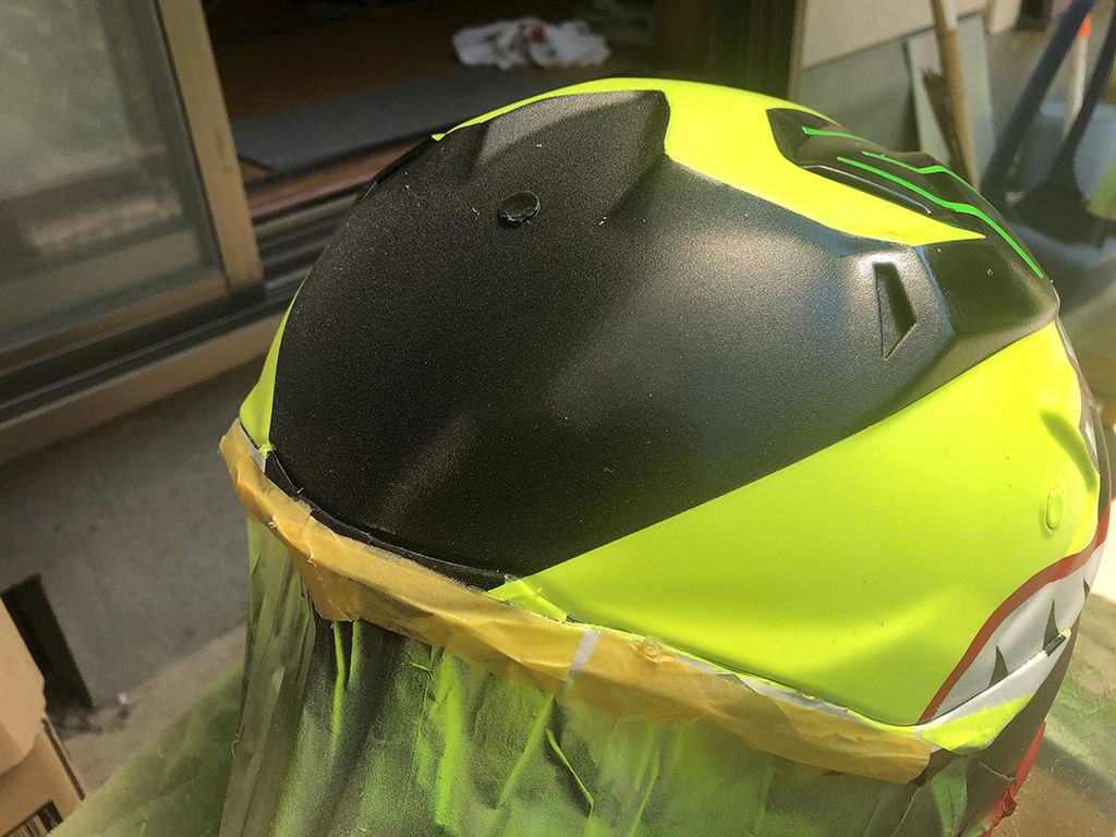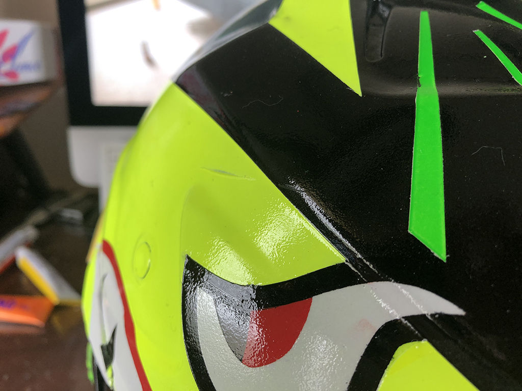 クリアを吹いた後は、十分乾燥させないと、表面が乾いても中は柔らかいという事が前に作った時もありましたので、1週間そのまま放置しました。ところが、乾いたと思ってヘルメットの上にバイザーを置いていたら、なんとバイザーの跡がヘルメットに付いてしまいました。もう、嫌になるやら、脱力するやら。落ち込んでても仕方ないので、凹んだ部分だけにマスキングして、その部分にスプレーして凹みを目立たなくし、その後、その部分に耐水ペーパーをかけて表面を均し、改めて余計な部分にマスキングしてスプレーし、傷を目立たない様に修正しました。