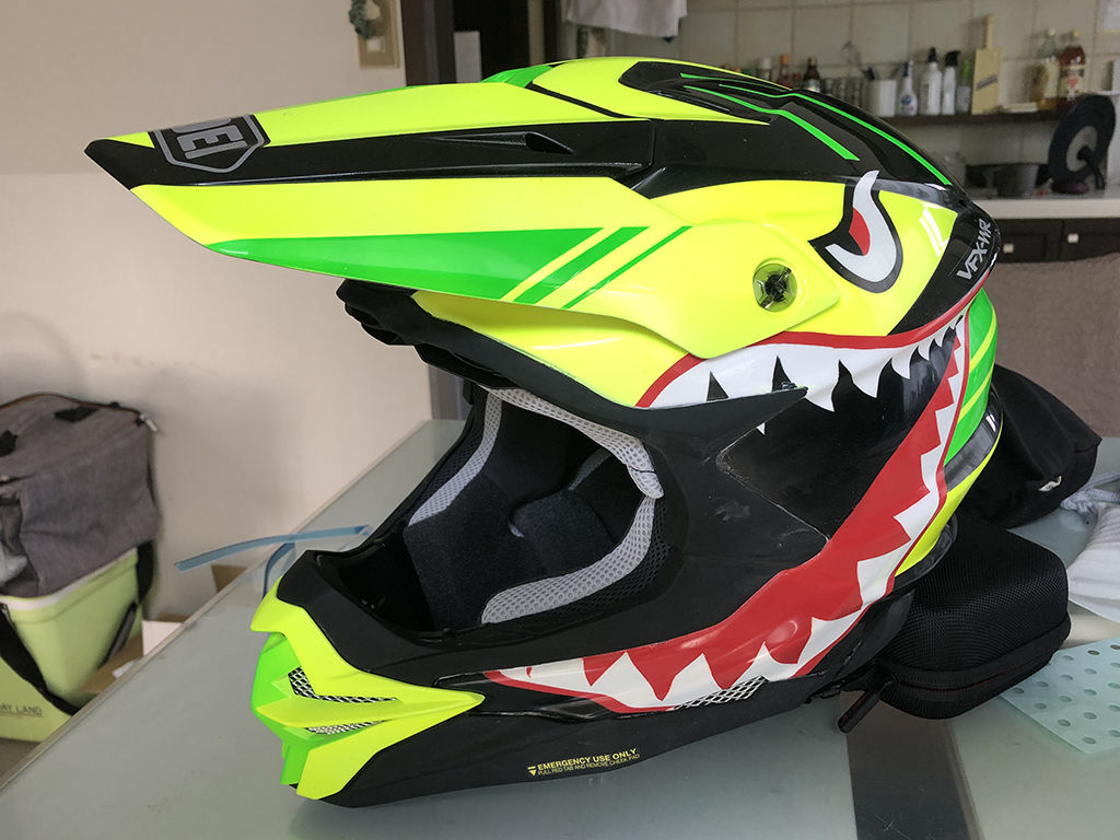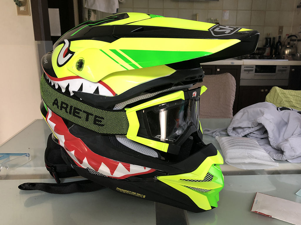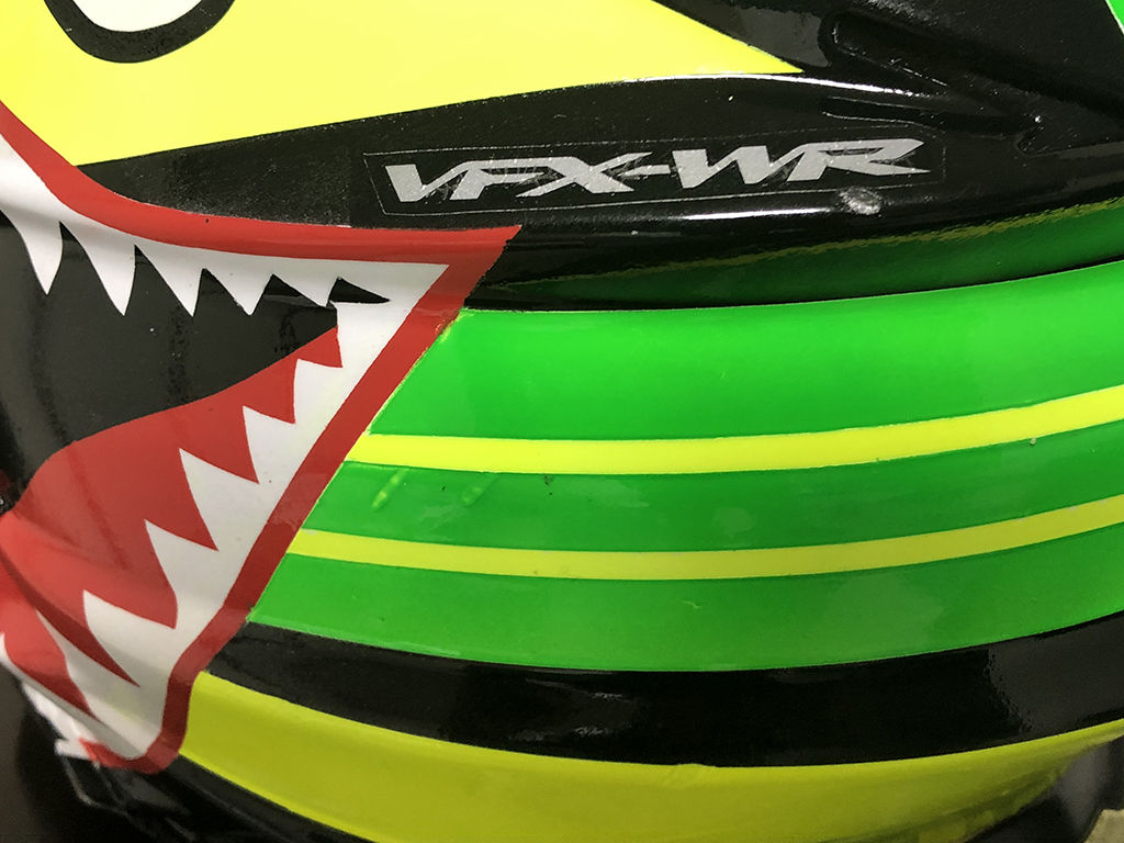 側面はシャークマウスを描く関係であまり懲りようが無かったのですが、正面から見た時にどう見えるかは、タニーヘルム1stが意外に地味だった事もあり、気を使いました。結果として、アリエテのゴーグルも蛍光イエローにする事で解決しました。後頭部はもうちょっと凝りたいところでしたが、デザインセンスの無さが有り有りと出てしまいました。もっとも、ここはバンドで隠れる部分なので、目を瞑った感じです。