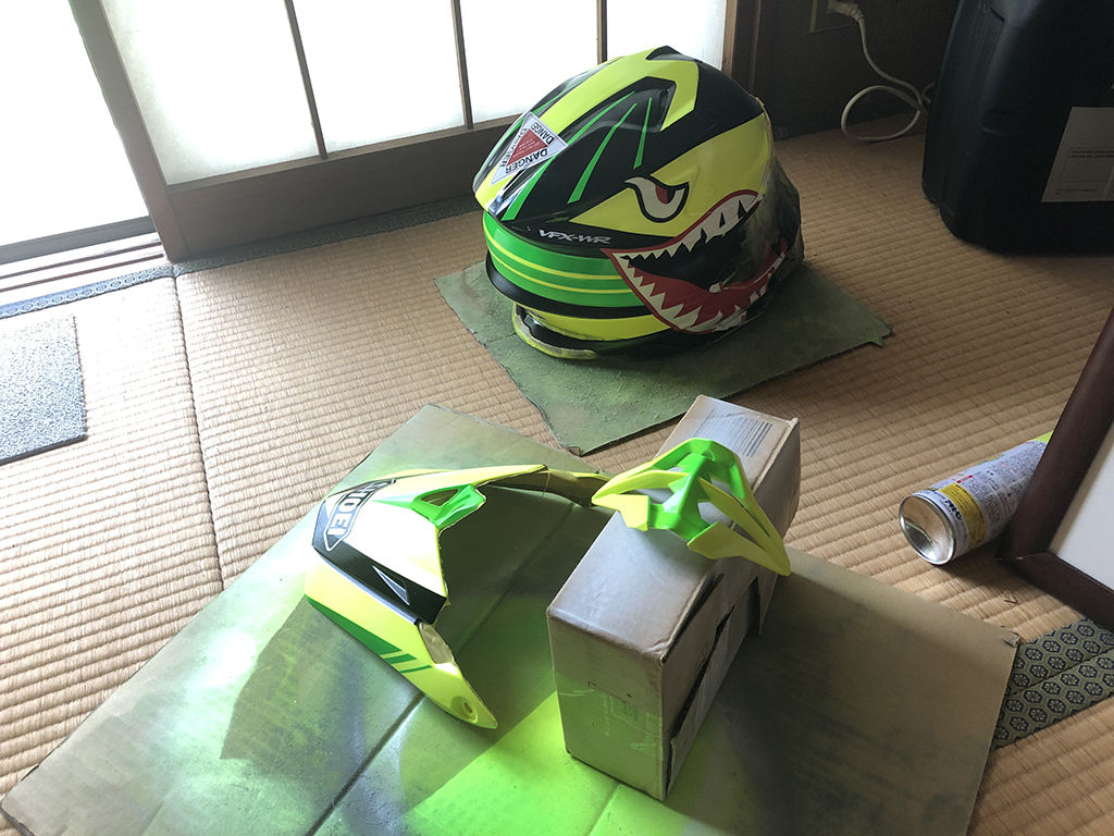 スプレーをよく混合させて、いきなり厚吹きするのでなく、出来れば均等に吹き、10分経ったらまた吹いて、というのを繰り返しました。バイザー、ノーズカバーも同時に作業し、5回吹いたところでスプレーがなくなりました。これもまた結構厚塗りだと思うのですが、ペーパーを掛けて研磨する関係上、安心の為に1本丸ごと吹きました。