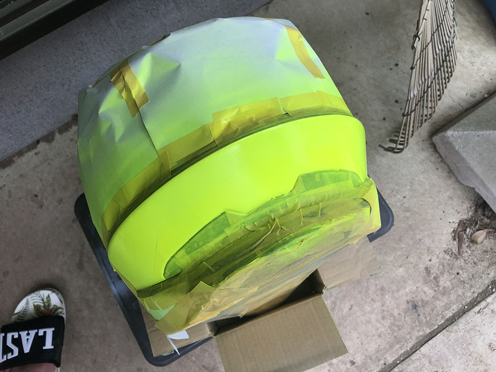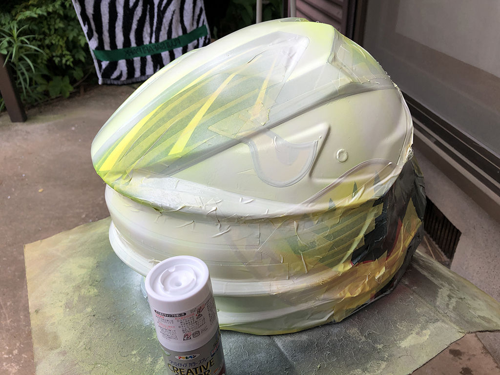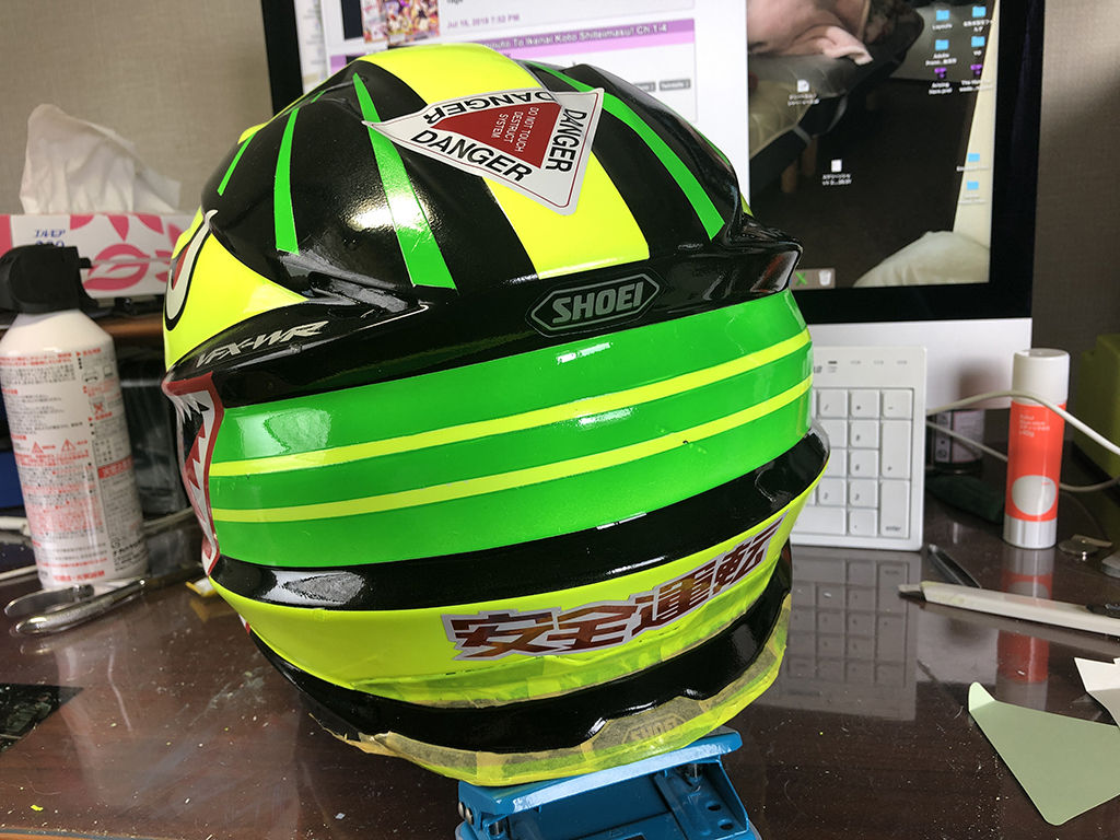 とりあえず、マスキングを全部剥がして点検してみた所、後頭部の下の部分の、帽体とゴムの間にイエローの吹き漏れがあったので、マスキングし直して蛍光イエローを吹いた所、厚塗りしすぎたせいかマスキングの段が出来てしまい、かつマスクした所としてない所で色の差が出てしまい、これを消す為に改めてイエローの部分全体を塗り直したものの、結局解消せず。その他にもぽちぽちやり直す必要を感じる部分があったのですが、やればやったでマスキングの浮いた部分に色が入り込んだりで、もうこれ以上は無理、「500m離れたら分からん」という事で諦めました。これまでに吹いた色を乾燥させてから、カラーを定着させる為にクリアを拭く作業。段差が出来てる部分には、捨てクリアを施す意味もあるのでそういった部分には厚めに吹いたのですが、これの乾燥中によりにもよってまた地面に落下。あちこち傷が入ったのですが、もうこの段階ではどうする事も出来ません。「今回の出来栄えは良くないのぉ」と諦めるしかありませんでした。