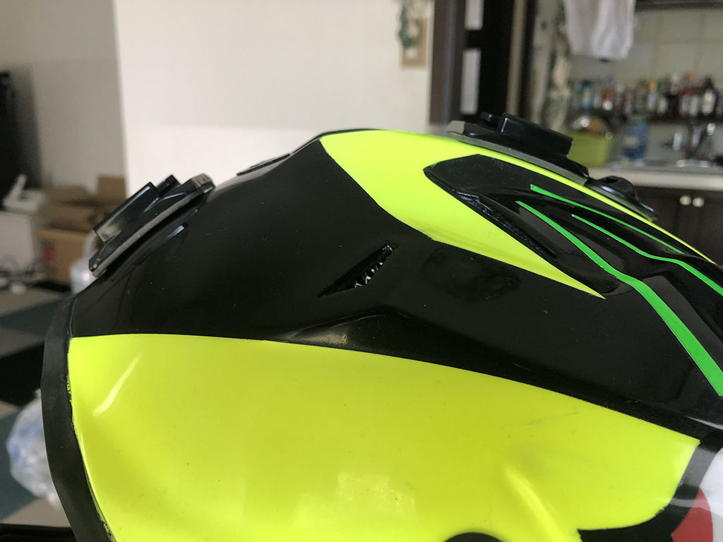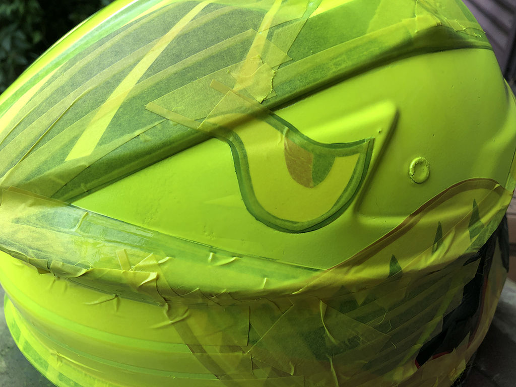 ヘルメット背面のゴーグルのバンドが掛かる部分のデザインは、塗装を剥がす前もかなり悩んだのですが、どっちみちバンドが掛かって見えなくなるのだから、シンプルに処理しました。こちらも先にホワイトを吹き直し、蛍光イエローのラインを入れてからグリーンを吹いたのですが、蛍光グリーンは何度吹いてもムラが消えず、結果厚塗りとなってしまったのですが、乾燥して驚いたのは、イエローのラインのマスキングの上下が、塗膜の収縮で隙間が空いてイエローの下地が見えてしまい、これを修正しようにも修正(隙間を埋める)ができず、結局ここでも「500m離れたら分からん」という事で諦めました。