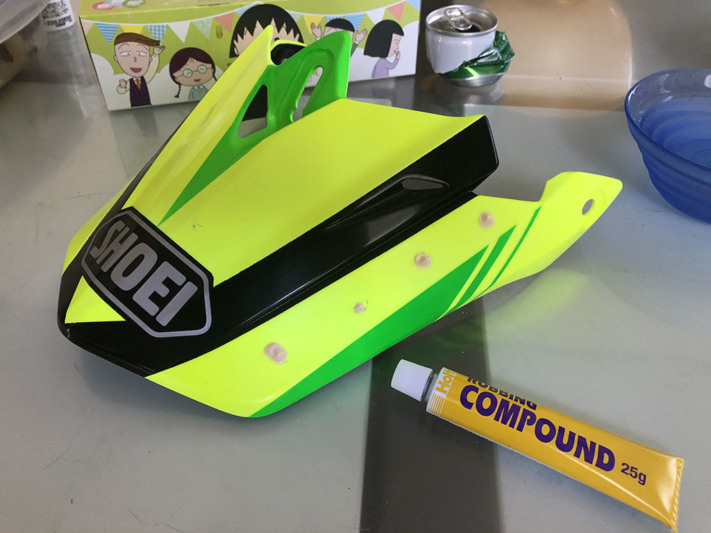 ペーパー掛けが終わったら、最後はコンパウンド掛け。粗目、細目、極細と順に丁寧に掛けていくのですが、磨きが進むにつれてヘルメットはピカピカになっていくのが嬉しい。これを見る為に、ここまで頑張った様なものです。