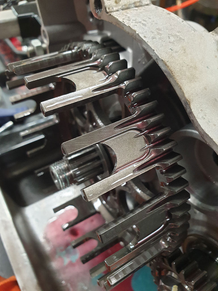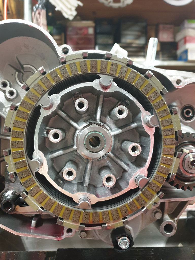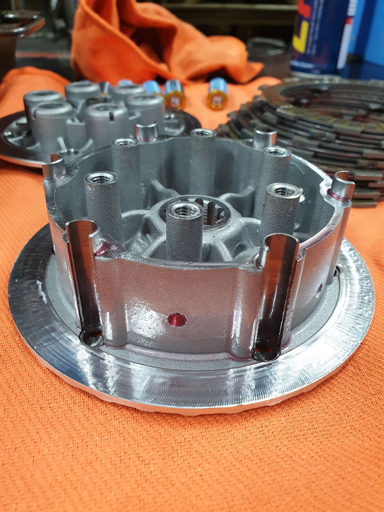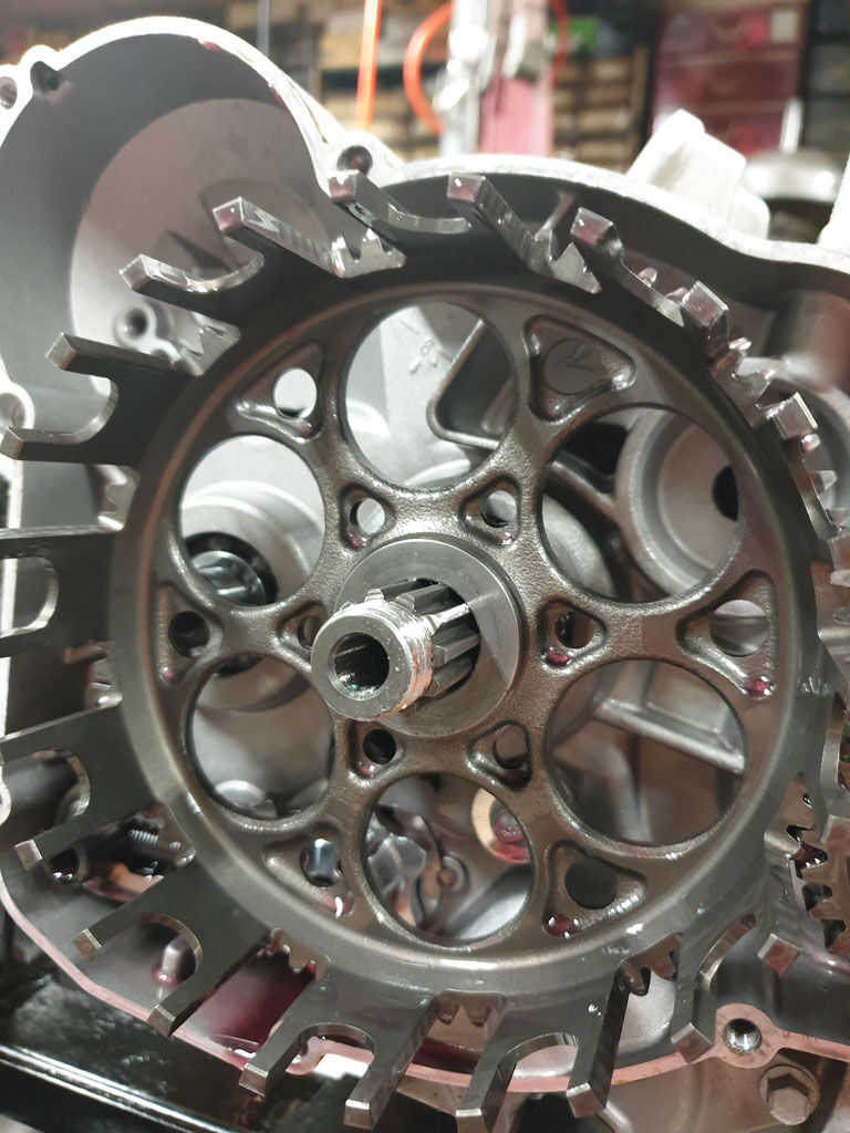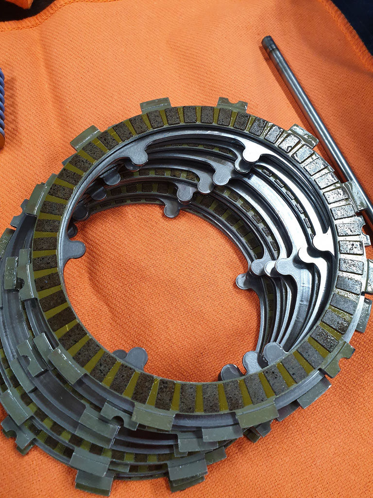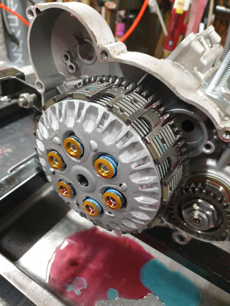特筆すべきは、クラッチの作り。これまで見た物とはかなり違っていて、クラッチ板やフリクション板をクラッチボスに組み込む部分が歯車状ではなく、丸っこい形になっています。そしてクラッチボスの方はと言うと、組み込む部分にステンレスのスリーブが設けられていて、見るからに動きがスムーズそうです。プレートプッシャーやバスケットも、極限まで肉抜きがなされており、これがBETAのクラッチの軽さの本質的なところではないか、と感じました。