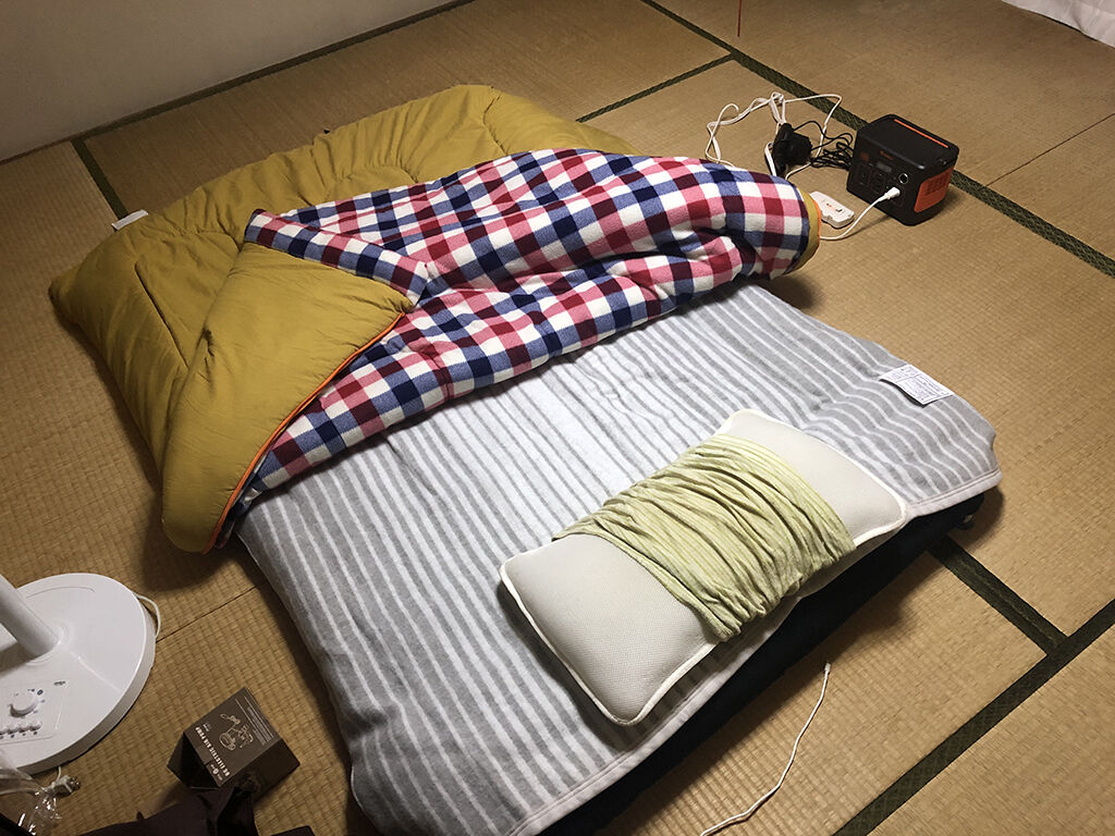 さて、肝心のポータブル電源での運用です。いきなりポータブル電源を買ってしまうのはリスキーなので、友達からJackery ポータブル電源 240というのを借りてきました。これは容量が66000mAh/240Whのものです。これを繋げて、「中」で使ってみました。温かさは家の電源と変わりません。しかし、4時間ほどでバッテリーが空になってしましました。ちなみにこの電源の持ち主は、80x130cmのサイズで「中」で7時間使って、バッテリーのメモリが1つ残る程度、という風に言っていました。その倍以上のサイズの毛布ですから、どうやら余計に電気を食うみたいです。