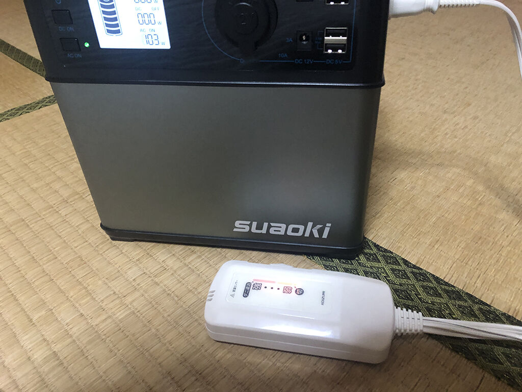 毛布のサイズが倍なら、電源の容量も倍にすれば良いと単純に考えて、suaoki PS5Bを買いました。これは容量が120000mAh/400Whと倍近くあります。これなら7時間くらいは持つだろうと期待して使ってみましたが。ところが、これも4時間ほどでタイムアップ。「中」にしたり、保温バッグにハクキンカイロと一緒に入れて使っても、あまり結果が変わりません。