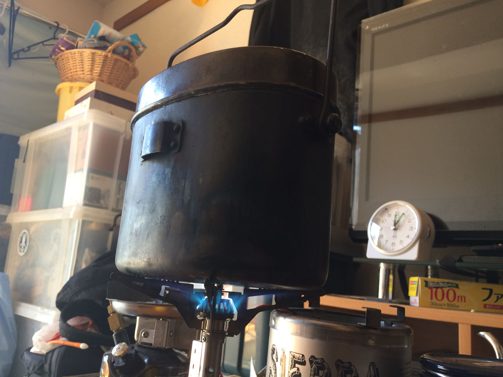 時代は下って、飯盒が日本でも使われる様になった時代、まだまだ料理はカマドで行われる事が一般的でしたし、ましてや軍隊が飯盒で炊事をするのは、戦地や演習、すなわち野外でしたから、薪を使って直火で使うのが前提でした。故に「飯盒炊爨」という熟語になった訳です。