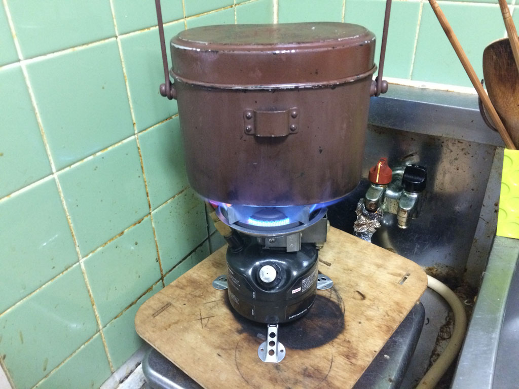 飯盒に当たる火の範囲が広いほど、α化がよりよく進みます。焚き火は飯盒の全周を覆う様に火が当たりますから、焚き火で炊いたご飯は美味しくなるのです。カマドで羽釜を使って炊いたご飯もこれと同じ理屈で、釜の底全体に火が当たるから美味しい訳で、「直火炊き」をうたう炊飯器の釜の構造もそれに準じています。同じ直火でも、バーナーヘッドの小さいコンロではあまり美味しくないのは、火の当たる範囲が狭く熱伝導の範囲が狭く、その他の部分のα化が進まない事が原因です。同様に2合炊きでは美味しかったのに4合ではイマイチだったりするのも、熱が伝導しない部分のα化が進みにくいからです。![]() | 広口バーナーで2合炊きの場合 バーナーヘッドの大きい家庭用コンロやストーブの場合、飯盒の底全体に火が当たり、かつ2合炊きの場合は嵩も低いので熱が上まで伝導し易く、比較的美味しいご飯が炊けます。 |