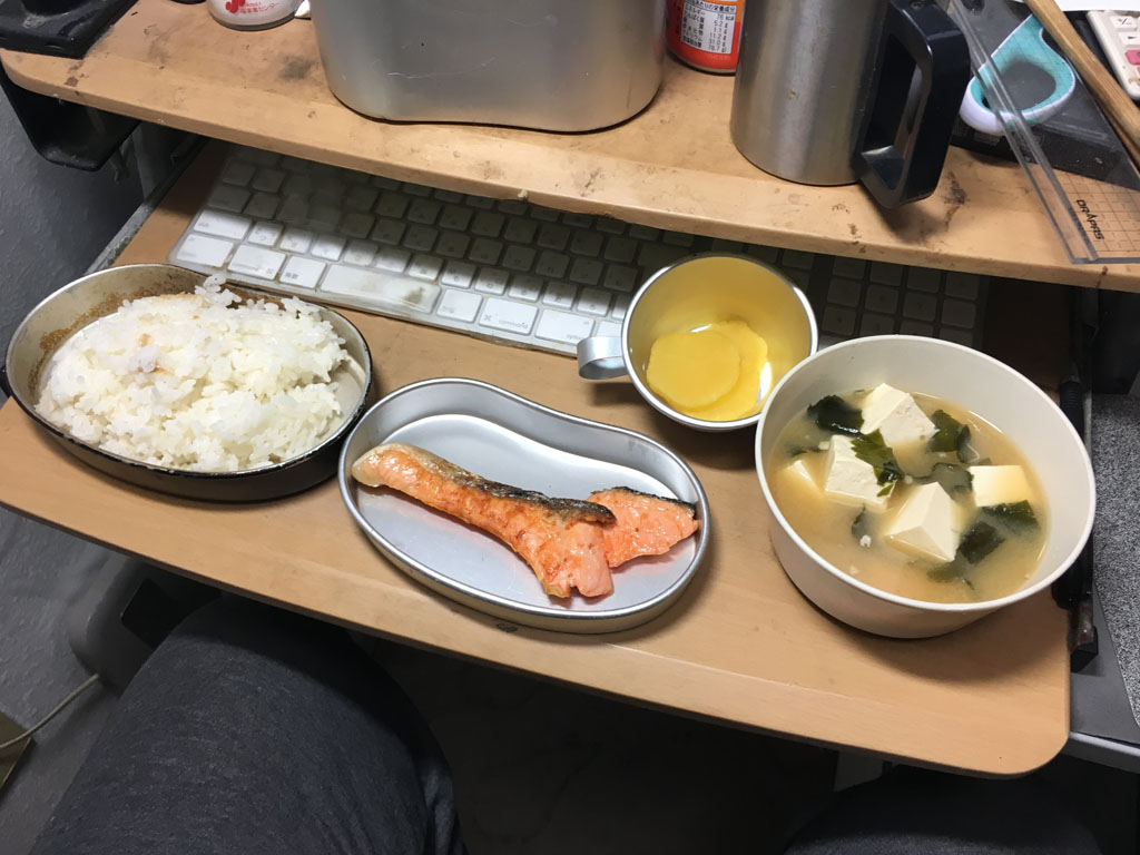 昔の人は、一汁一菜といって、オカズはほとんど食べずご飯ばっかり食べていた、という話しがありますが、焚き火で炊いた美味しいご飯を食べてみると、欲しくなるのは沢庵や梅干しといった漬け物や、メザシといった焼き魚、みそ汁、果ては塩や醤油、味噌といった、いわゆる一汁一菜のおかずが欲しくなります。昔の人は、カマドで薪を焚いて、お釜でご飯を炊いていた訳ですが、お釜も下半分に火が当たる構造ですし、焚き火で炊いたご飯は唸るほど美味くて、大したオカズが要らなかったのではないか、と思うのです。