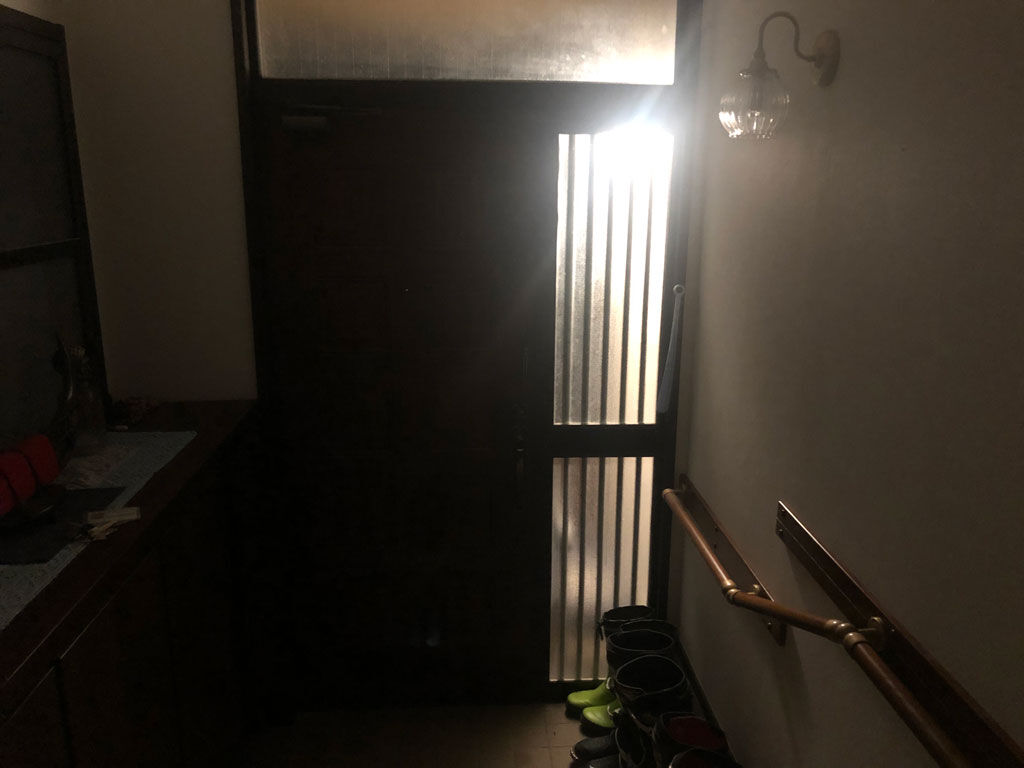 取り付けは、前の電球を外してつけるだけ。スイッチを入れると一旦灯ますが、3分ほどで消えます。昼間は周りが明るい事もあって、近づいても手をかざしても点灯しません。そこで暗くなってからテスト。そろ〜っと近づいて、インターホンに手を伸ばした辺りで点灯。とても明るいです。これで真夜中に帰ってきても、目を凝らして鍵穴を探す必要はなくなりました。また、荷物の積み込みとかでも足元明るくて安全です。夜中に人が来ても、ばっちり見えるでしょう。