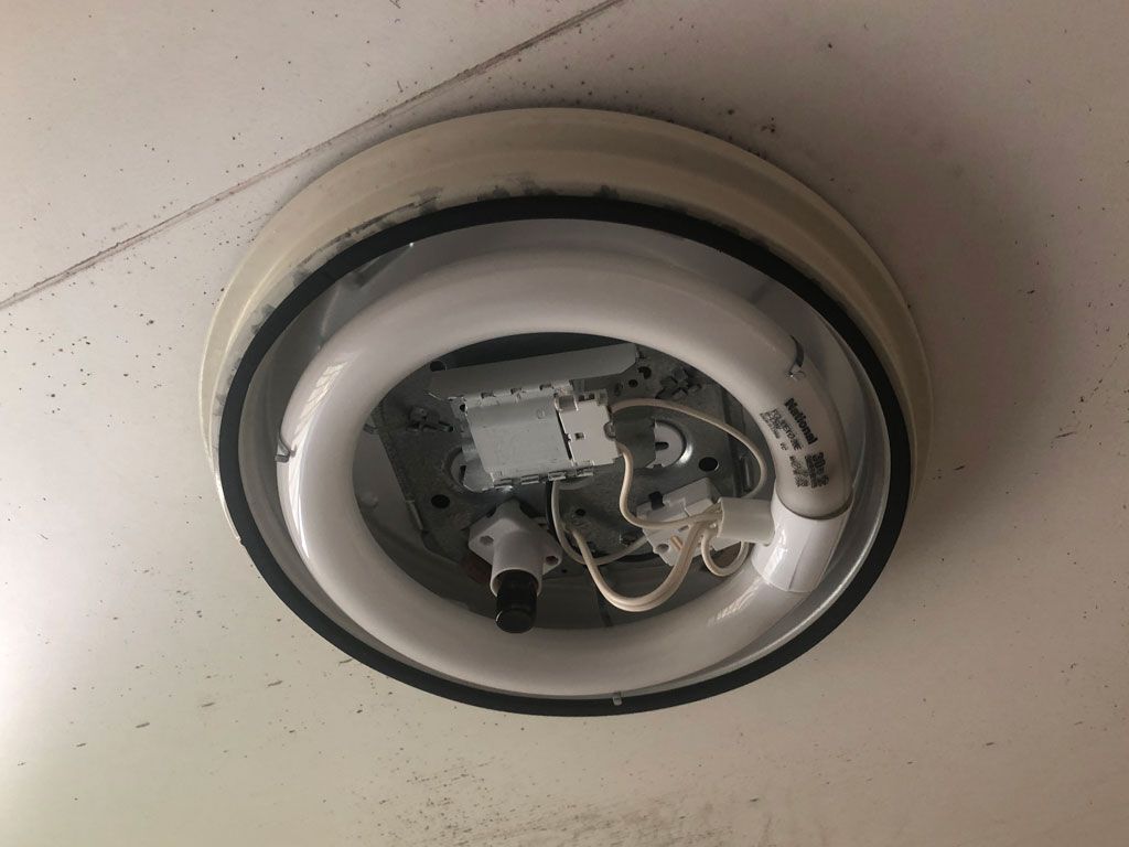 工事屋さんが工事をしてたので、自分は見てただけだったのですが、外した浴室灯を見て工事屋さんが「この蛍光灯は一度も交換した事がないのですか?」と聞いてきました。自分は3年前から住んでるのでよう分かりませんが、結構古いもののよう。この家がナショナル住宅である事をいうと、なるほどというう感じでした。