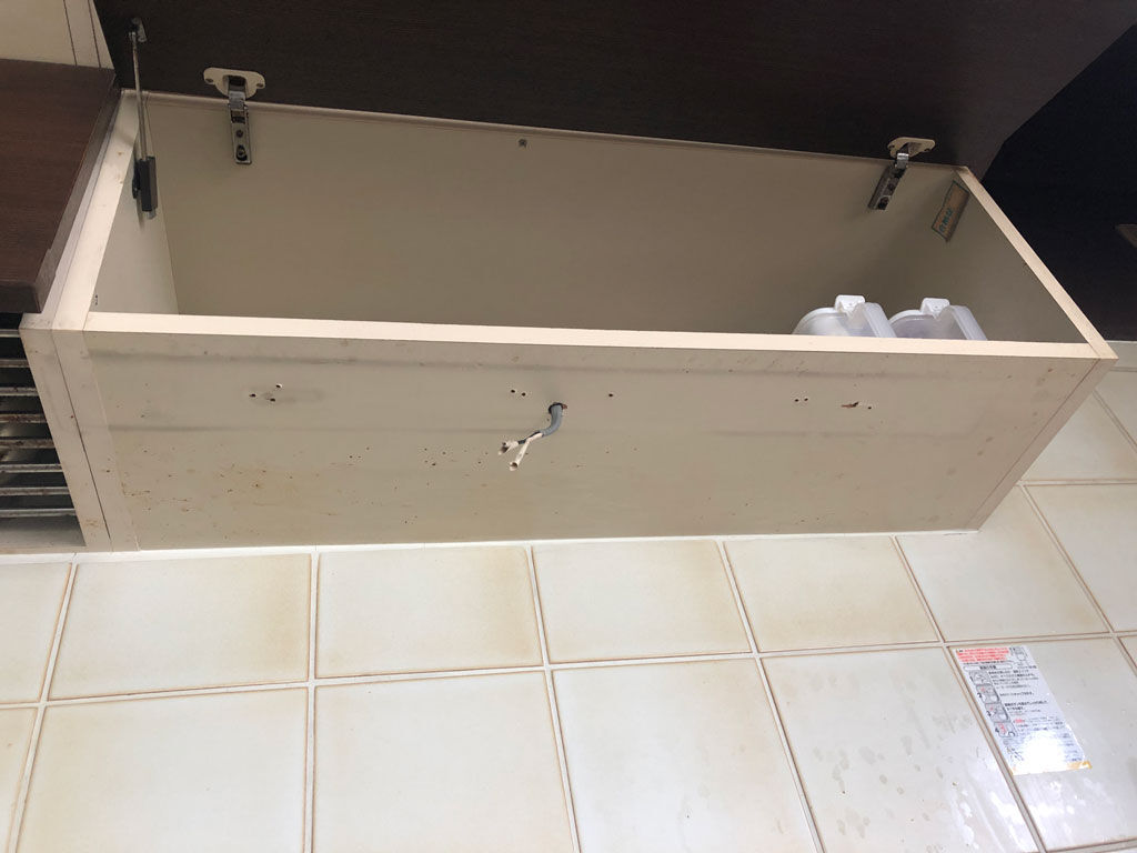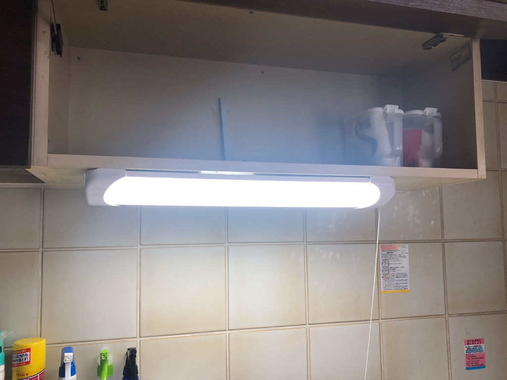 この工事も見てただけですが、新しいLED流し元灯は、古い蛍光灯のよりも幅があったらしくて、前の配線の穴のままに流し元灯をつけると、棚の蓋が閉まらないという事で、配線の穴を広げて線を奧に逃がしてくれました。そういうイレギュラーな事があっても、専門の業者ならその場でチャッチャと仕事してくれますので、少々工賃が高くついても、頼み甲斐があるというものです。