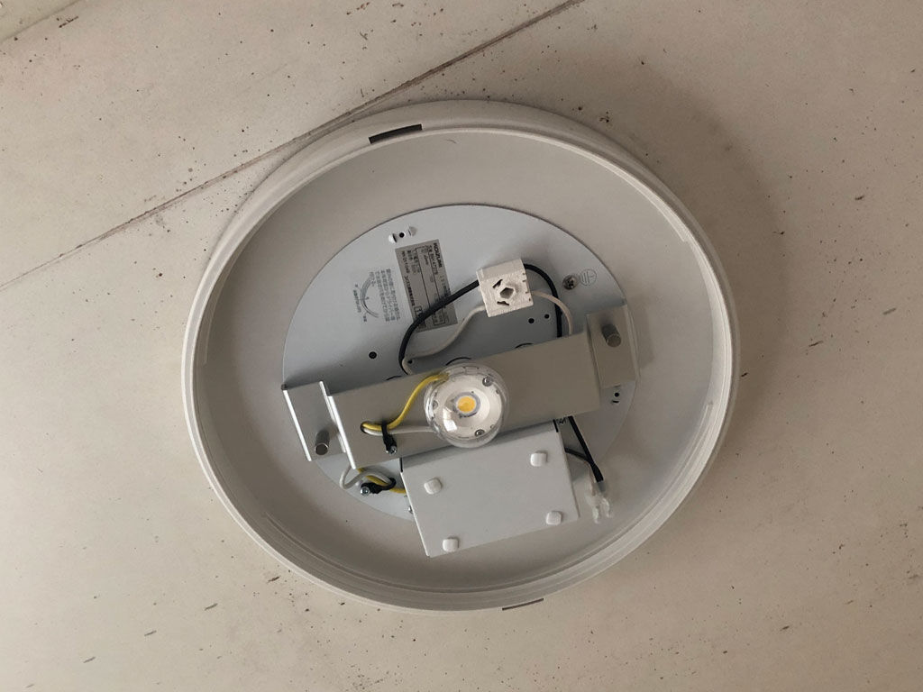 これまで使ってた浴室灯は、ナショナル製の直結型のもので、今回のコイズミ製のLED浴室灯も直結型。直結型の場合、電気工事士の資格がないと工事できないので、浴室灯買ったケーズデンキで頼みました。部屋用のシーリングライトは、その名の通りシーリングでつけますので、元からシーリングだと自分でも付け替え出来ますが、この家は1989年建築の古い家で、これまでにも直結からシーリングに替える工事を頼んできました。もっとも、浴室灯や後述の流し元灯は、今でも直結型が多いそうです。