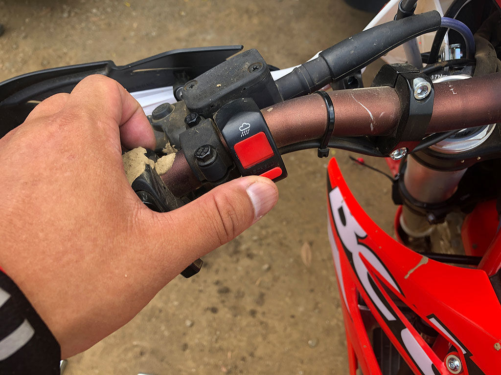 問題なのは、モードスイッチの位置。現状だと、ちょっと親指が届きにくいのです。慣れてないせいもありますが、いちいちスイッチの位置を視認して押す様な感じ。これだと操作に遅れが出たりもします。ウインカーホーンスイッチは公道化する時に必要なので外せないので、クラッチレバーブラケットの左側にモードスイッチが来てくれたら、もっと操作しやすいのですが、敗戦の関係もあるので、ちょっと様子見です。