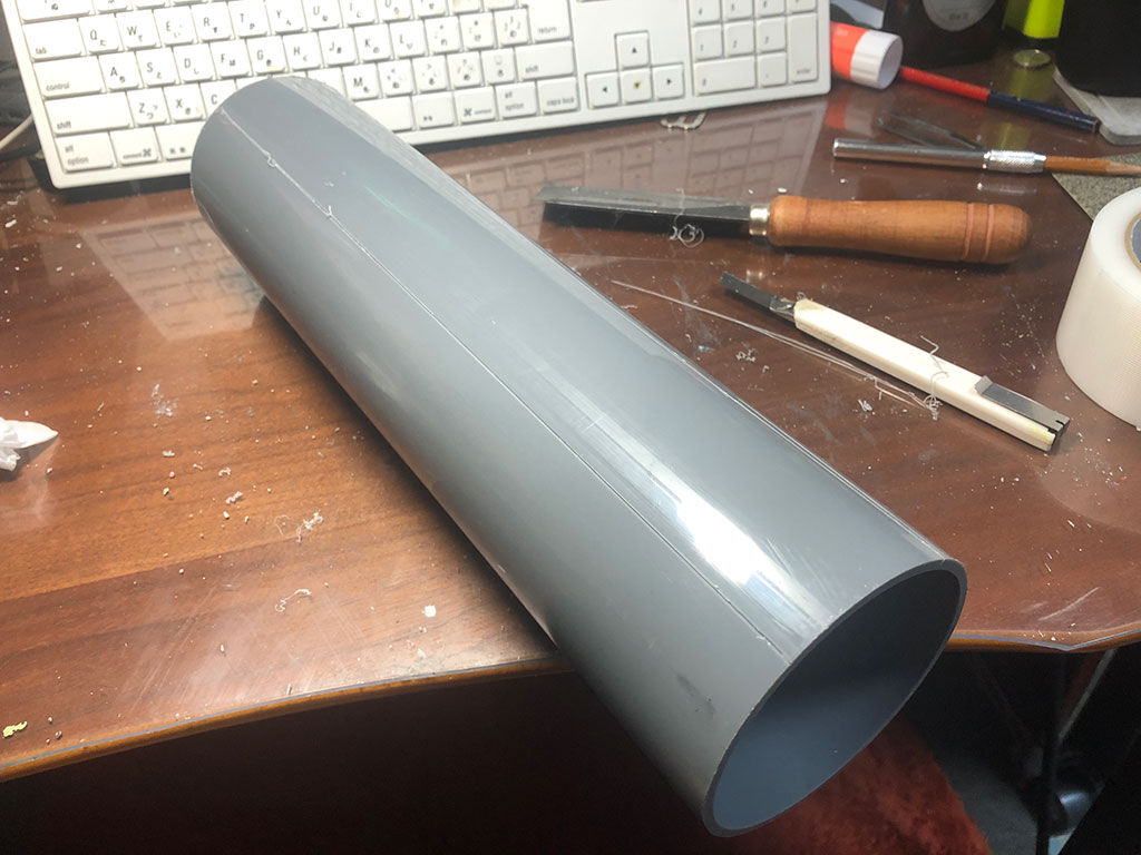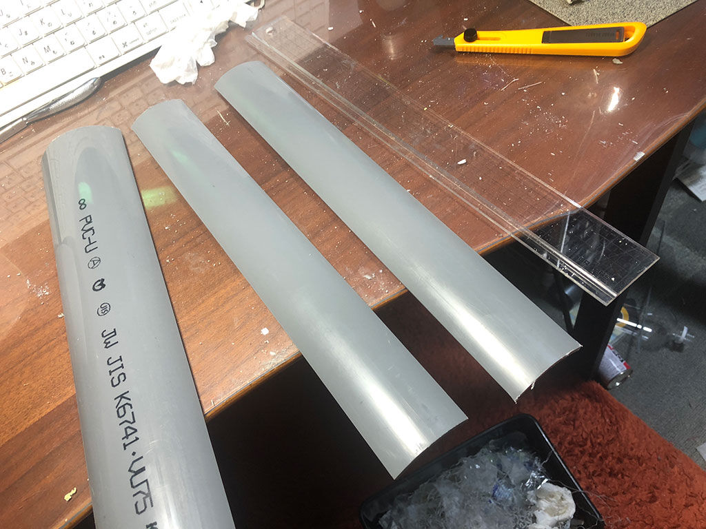 あまり細いのは使えませんし、太いのは切るのが大変です。そこで目見当でVU75のサイズの塩ビ管を買って帰り、フレームの長さを測り(35cm)、必要な幅も養生テープで測り(60mm)、ピラニアソーで35cmに切断した上で、Pカッターを使って60mm幅に切り出しました。一人でやるのは結構たいへんだったので、嫁さんに定規を固定するのを手伝って貰い、いい感じにPカッターでけがいてから切り出しました。