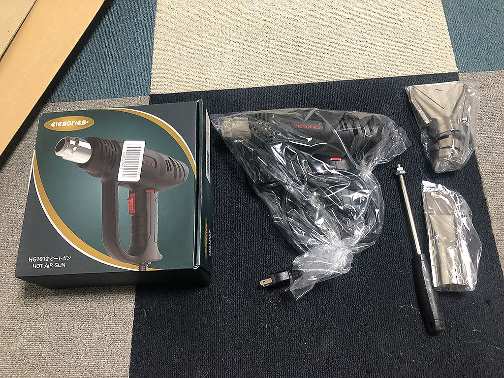 実はヒートガンなる物も今回初めて聞いた道具で、上にも書いた様に、要するにドライヤーのもっと強力なやつです。用途としては、プラスチック素材を曲げるのに使ったり、車に貼ったステッカーを剥がしたり、食材の解凍と言った用途にも使える様です。