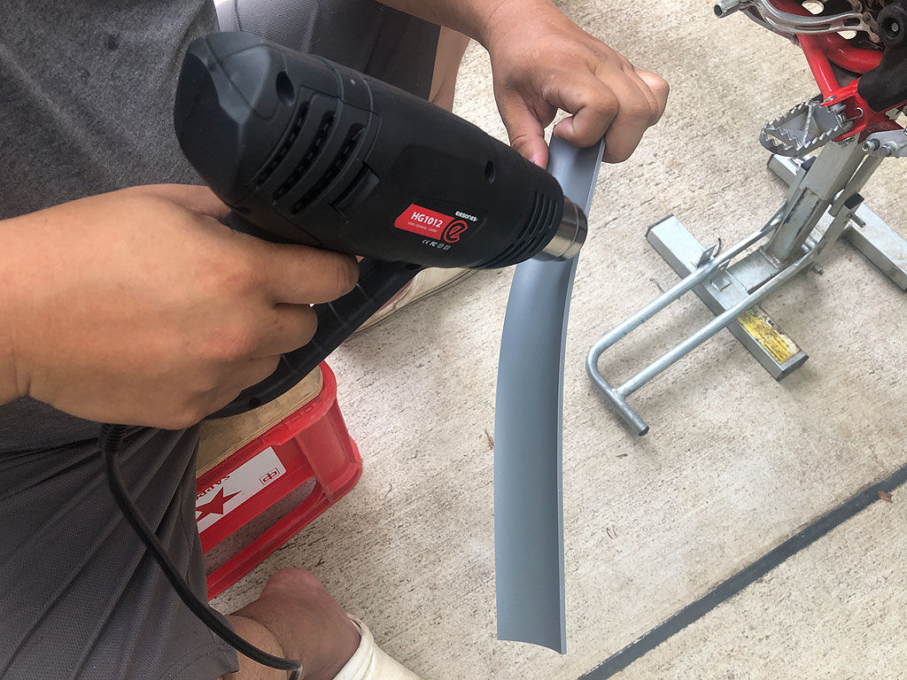 初めて使うヒートガン、最初は恐々でした。クロトレのフレームは微妙に湾曲し、また溶接部分もあるので、それらの形に合わせて塩ビ管を成形せねばならないのですが、どんな具合にヒートガンで熱すれば良いのか勝手が分かりません。なので最初はちょっとずつ温めて、塩ビ管が曲がりそうになったらフレームに押し付けて形を作る、というのを繰り返しました。