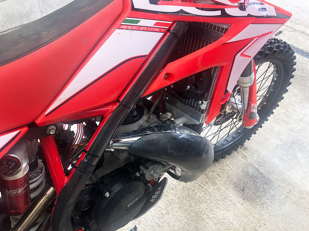クロトレのタンクはRRに比べるとスリムなのが特徴です。それでいてタンク容量は8.6リットルもあるのですから、驚異的です。この容量はCRF450RXに匹敵するのですが、そのタンク周りのボリュームの差は歴然としていて、圧倒的にクロストレイナーの方が細く、見るからに軽い印象があります。