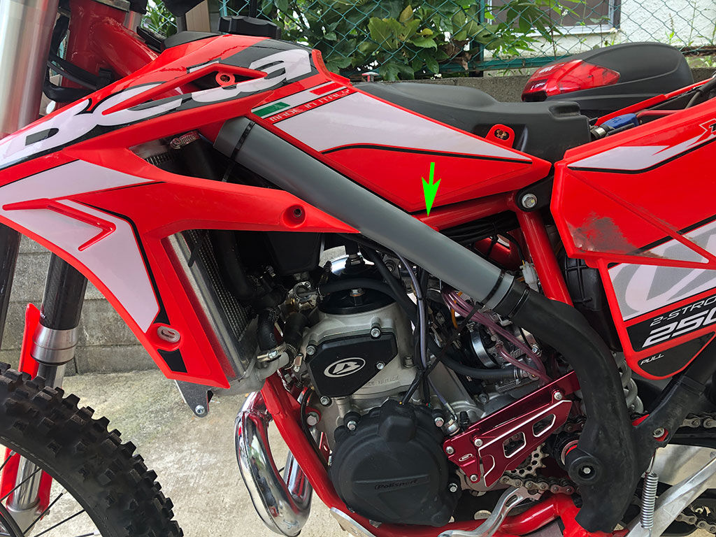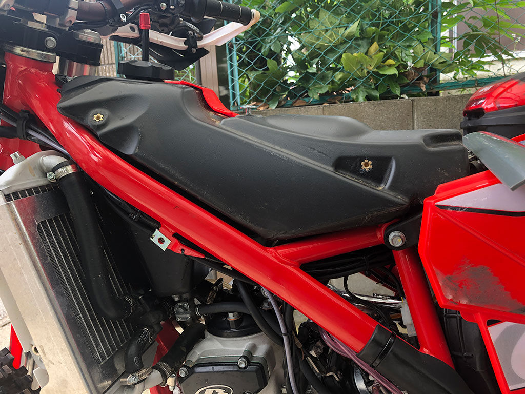 その一方で、タンクをのせるフレームは上の方までむき出しになっています。フレームの幅ギリギリまでタンクを細くした結果ですが、問題は、横にコケた時、地面に岩などがあった場合、フレームを傷つけてしまう可能性がある事です。クロトレのフレームは鉄で、美しい赤の塗装が施されています。オフロードバイクですから、傷が入るのは宿命としても、外装の様に交換が利く部分ならともかく、フレームに傷が入るのはなるべくなら避けたいところです。
