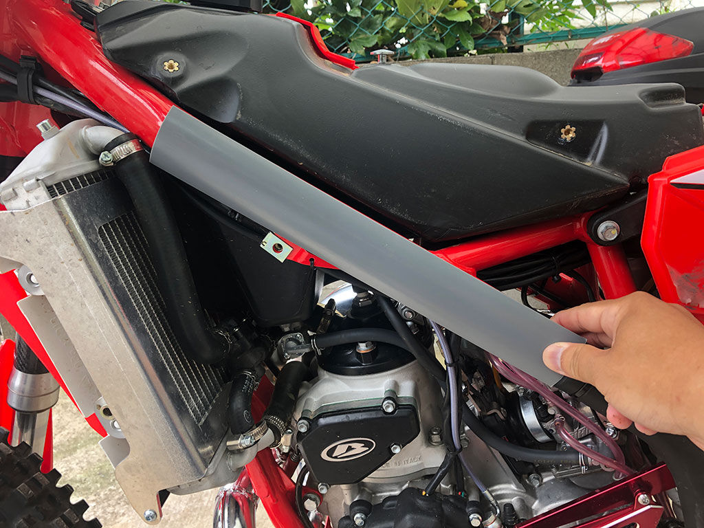 完成した塩ビ管フレームガード、そのままでは付きません。接着などしようものなら、外す時に塗装が剥げたりする可能性もあるので、ここはタイラップ留めを採用する他ありませんでした。もっとも、塩ビ管を直接フレームに付けたのでは、振動や衝撃などで、フレームが擦れてしまう可能性もあります。そこでガードの裏に隙間テープを貼る事でクッション代わりにしました。