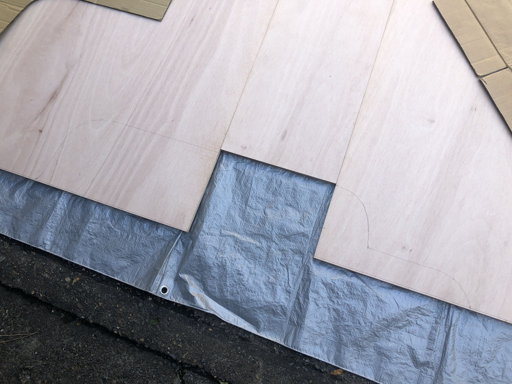 買ったコンパネを型紙に書いてあった寸法でホームセンターでカットしてもらい、タイヤハウスなどの曲線部分は自分でジグソーで切る事に。ところが、いざ型紙をのせて下書きしてみると、あちこちずれている様な感じで、この状態で切ってしまうのには不安を感じましたので、切る作業は現車が来てからやる事にしました。