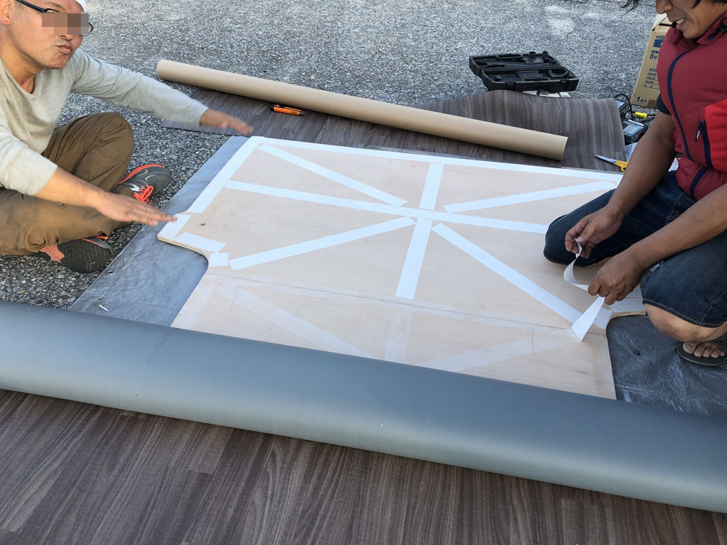 連結ができたら、3人でそろそろゆっくりと床板をひっくり返し(雑に扱うと、接合部分のアングルが折れ曲がってしまうから)、今度はフロア材を貼ります。今回も両面テープで貼る事にしたのですが、ここで失敗。フロア材用のごつい両面テープでないと剥がれてくるそうで、実際、普通の「強力両面テープ」では、フロア材を床材の形に切るためにひっくり返すと、剥がれてきました。そこでバイク屋さんから残ってたフロア用の両面テープをもらってきて、主要な部分に使ってずれない程度にとめれる様にしました。