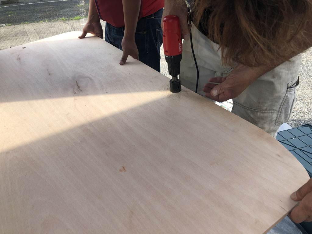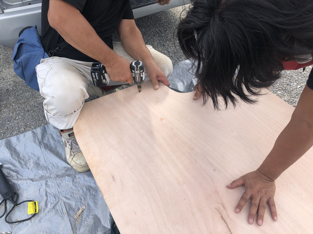 実は自分ともう一人が板材を加工している間、もう一人はシートカバーを取り付ける作業をしていて、そっちも一人では大変でお店に来てたお店のお客さんに手伝ってもらって取り付けました。取り付け中の写真を撮ってないので、カバーの方は艤装編で紹介したいと思います。