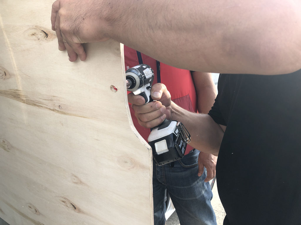 これでようやく、床板を連結する段階まで進みました。この時点で自分は結構出来上がってましたが、連結はきっちりやらないといけないので、裏からアングルでどんどんビス止めしていきます。最初の取り付けが出来たら、あとは板は動かないので、仲間に任せる事にして、アスファルトの上についた膝の痛みに耐えながら、ビスをどんどん入れていきました。この時バイク屋さんが、この「大記録」のXR230の記事を見てお店を訪ねてきたお客さんを紹介してくれたのですが、疲れてるわ、時間は迫ってるわ、早よやらないかんわで、もういっぱいいっぱいでロクに挨拶もお礼も言えず、申し訳ない事をしました。