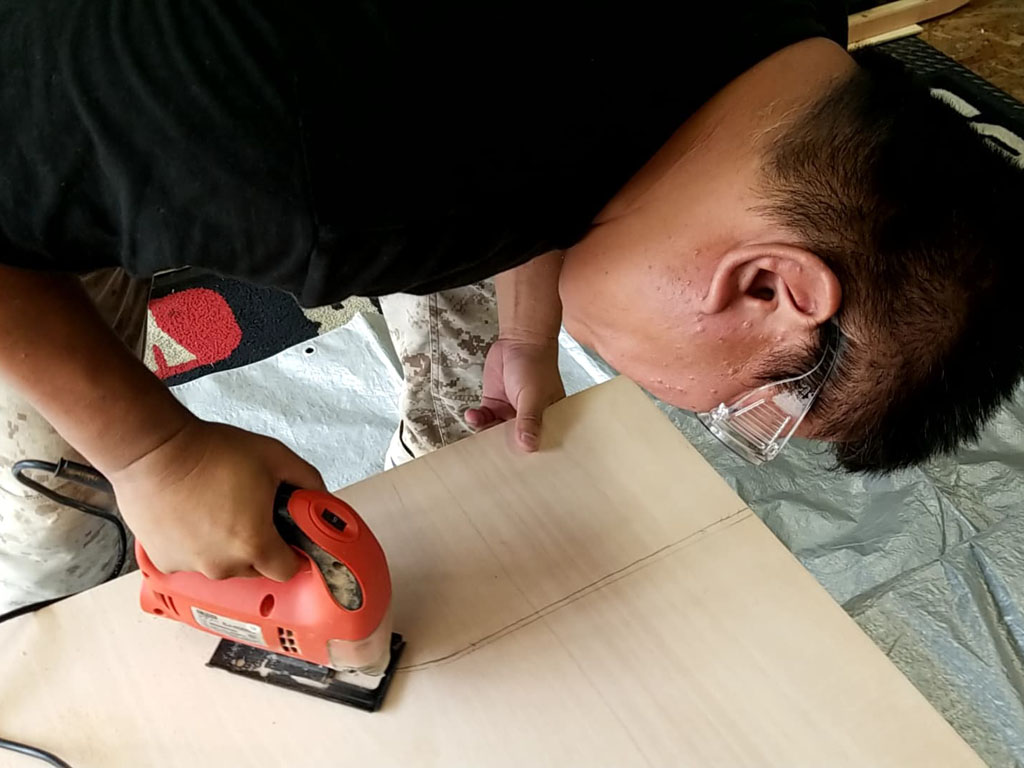 下書きが出来たら、ジグソーで切っていきます。ジグソーは11年前に買った安物で、まさか2台目のトランポの板張りに使うとは思ってませんでした。よく歯が外れますが、それなりに頑張ってくれます。切り子が目に入る事が多いので、今回は防塵メガネをして作業しました。直線部分も頑張ってジグソーで切ってましたが、あとで借りた丸ノコの方が直線ははるかに綺麗に切れる事が分かりました。