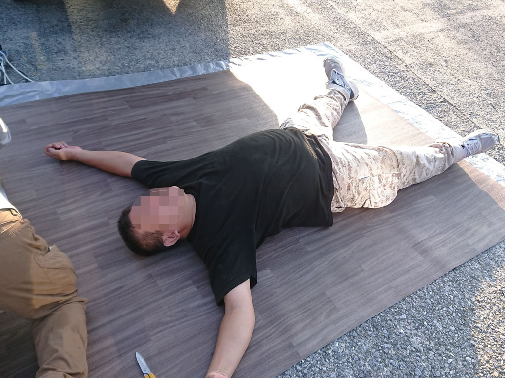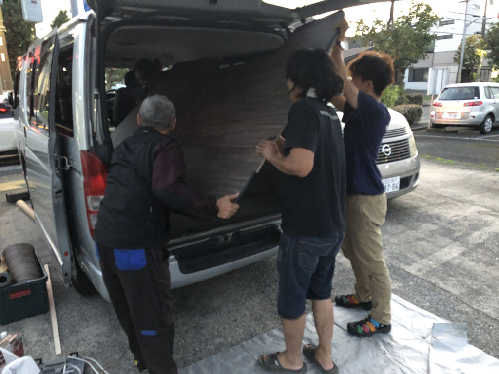 切り終わったら、一旦荷室に敷いてみて、再度調整。ぴったり合わせたつもりでも案外ズレてたりして、それを改めて切ったりはすったりして、合わせていきます。荷室の床に直接はめ込む方式より根気と時間がかかります。折しも長かった梅雨が明けて、いきなりの夏日、空調効いてる店の中はともかく、外での作業は時間を追うごとに体力が削られていきました。