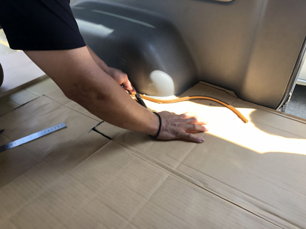 さて、いよいよ作業開始です。まずは借りた型紙を荷室に敷いて、実際のところはどんな感じになっているか、確かめます。現車に合わせて型紙を若干修正してもらい、下絵をコンパネに描きます。ここで注意せねばならないのは、床板の縁はU字モールを打ち込んで処理するので、その分、板も車体の内側で切らねばならない事です。その為には位置決めが重要で、これは経験を要する作業になりますので、バイク屋さんに調整して貰いました。
