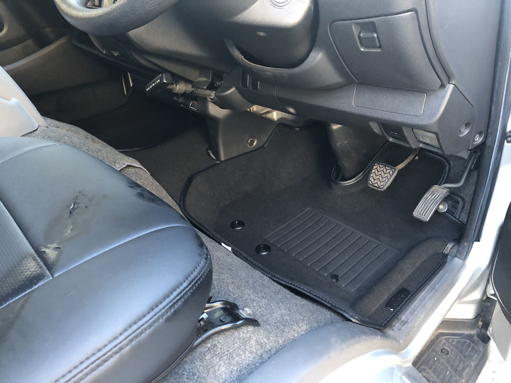 シートカバーだけでなく、床にも立体フロアを敷きました。というのは、パドックが泥だらけでどうし様もない時もよくあり、そういう時は泥足で乗り込む他ないのですが、フロアがあれば、それだけ外して掃除すれば良く、車本体の汚れは極力防ぐ事が出来るからです。これもクラッツィオの物にしましたが、これは敷くだけなので簡単です。