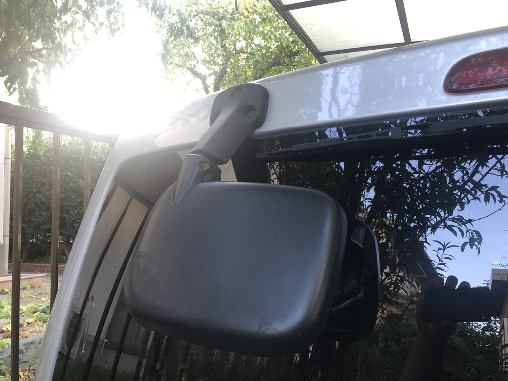 これもバイク屋さんからオススメされたのですが、これの凄いのは、ルームミラーがモニターになっている事。つまり、ルームミラーに後方カメラの映像が映っているのです。スイッチをオフにすれば、普通のミラーになります。まぁ、まずオフにする事はないのですが、映像がキレイなので、リアハッチのスモークガラス越しにミラーに映る後方の像より、見やすいです。個人的には、昼間など明るい時は、薄っすらと後ろの荷室の像が見えたりするので、これはこれで便利かなと思ってます。