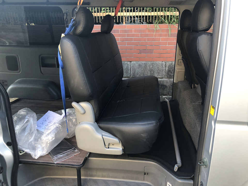 そこで今回はシートカバーをつけて養生する事にしました。200系ハイエースのシートカバーは色んなとこから色んな物が出ているのですが、どれが良いか良く分からなかったので、バイク屋さんが勧めてくれたクラッツィオのシートカバーを選びました。このシートカバーは座席を外さずに取り付けが可能なのですが、自分でやるのは大変そうだったので、床板の作業をやってる間に他の人にやって貰いました。暑い中大変そうでしたが、良い感じに被せる事が出来ました。