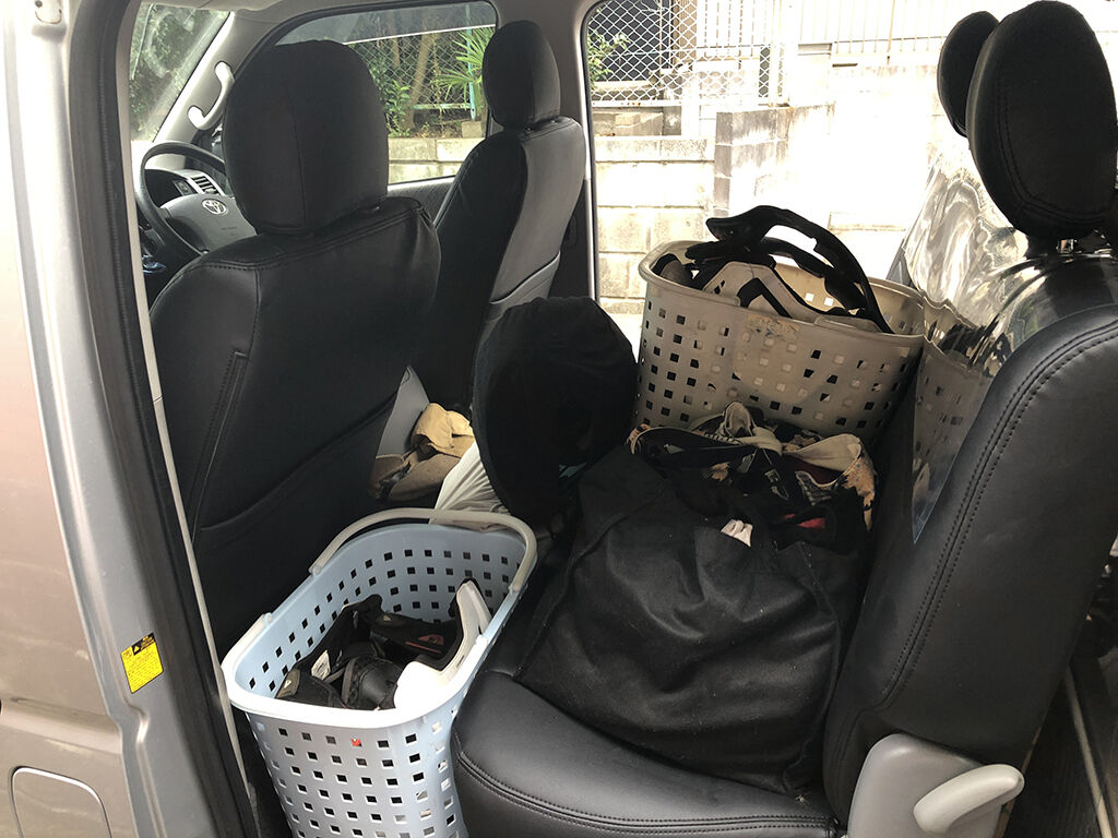 これらはその都度出し入れする装備で、セカンドシートの上に乗せていますが、それほど出し入れしない物で荷室の方に置けないものは、セカンドシートの足下に置いています。