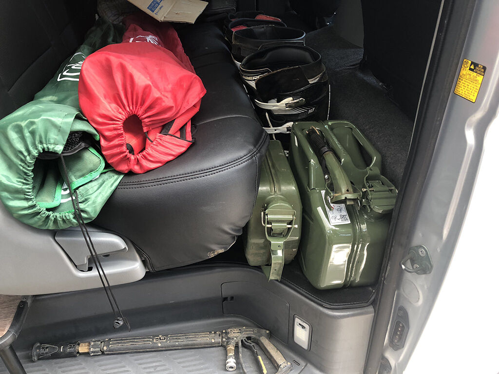 トランポに搭載する装備には、「常時搭載するもの」と、洗濯や整備で「その都度搭載するもの」の二つに分かれます。セカンドシートは駐車場にトランポを駐めている時でもアクセス出来る事から、後者の「その都度搭載するもの」をチョイスする事にしました。具体的には、これらの品々です。