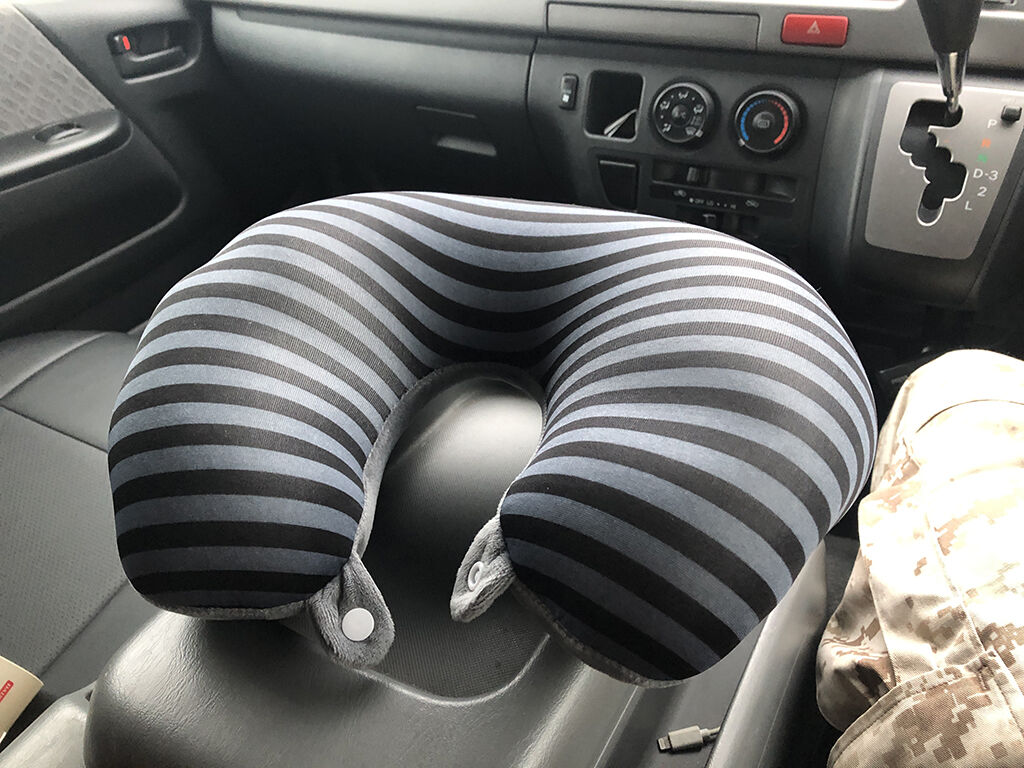 あと、運転席のシートをリクライニングさせて仮眠する時に、ちょうど首の窪みが、ヘッドレストとシートが連結してる窪みの部分と重なり、首が結構辛い事になっていたので、ダイソーで売ってたネックピローを買ってきました(300円)。これがズバコンに具合が良くて、すぐ寝落ちする感じです。寝たい時にさっと取り出せる様に、運転席の後ろに常備しておく事にしました。