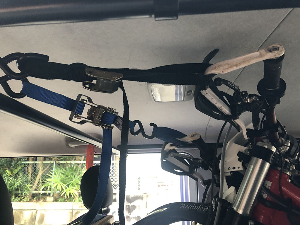 また、クロトレにかけるタイダウンの位置も変更し、TT-Rもクロトレも、左右同じ位置、つまり右は車体のD環に、左はアシストハンドル(に掛けたサブベルト)から、それぞれ引っ張る形にしました。また、ハンドル側でしか固定をしていないので、運転中にバイクのリアが左に流される事がままあったので、一番右のTT-Rのスイングアームを、荷室後方の荷室の床のD環からタイダウンで引っ張る事にしました。