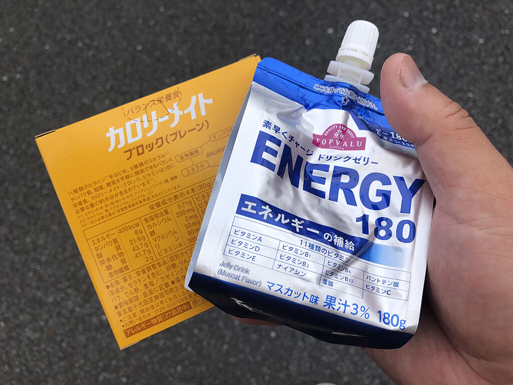 さて、カロリーメイトのブロックですが、これ、ぶっちゃけ油っ気の少ないショートブレッドなので、そのままだと口の中の水分を全部吸われて、喉につかえます。普段ならそれでも良いですが、やっぱりレース前だとそれでは具合が悪い。何か飲料を併用すれば良いのですが、ジュースの類もやっぱり飲みたくない。そこで、チューブ入りのゼリー飲料を併用する事にしました。