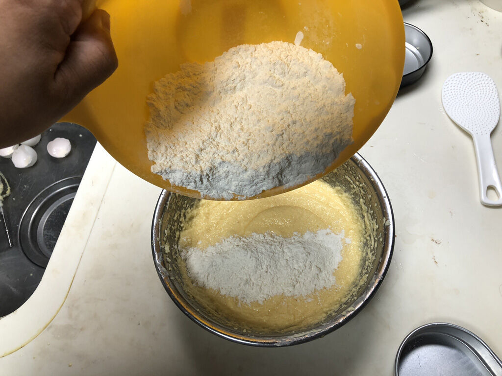 - 卵が混ざったら、ラム酒を入れてかき混ぜ、ベーキングパウダーを混ぜた薄力粉を入れて混ぜます。これは一気に入れて大丈夫ですが、問題は混ぜ方で、ぐるぐるかき回す様なやり方でなく、ゴムベラで切る様に混ぜ、時々ひっくり返して徐々に混ぜていきます。ドライフルーツを入れたりするなら、完全に粉が混ざってから混ぜ込みます。