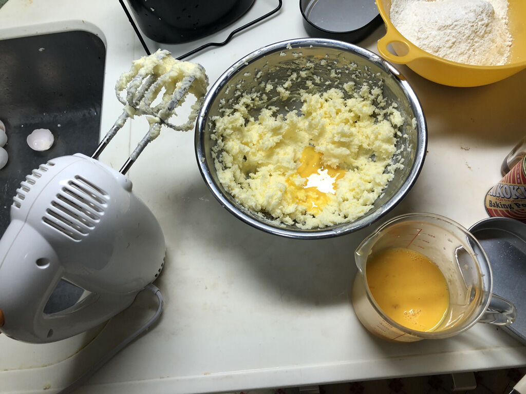 - 次に溶き卵を混ぜます。これはほんのちょっとずつ、混ぜていきます。一気にドバッと入れると、なかなか上手い事混ざりません。室温が寒い等、上手いこと混ざらないときは、ボウルをぬるま湯に入れながらやると、上手い事いく時があります。ただし、バターが溶けない様に注意です。