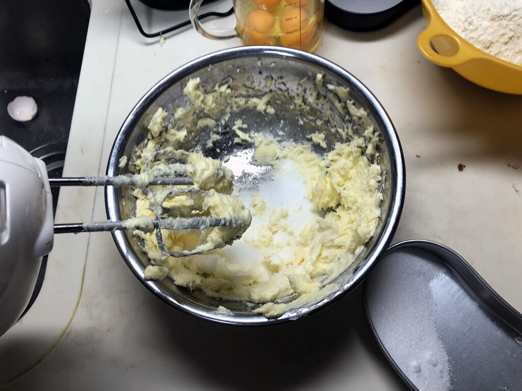 - 常温に戻したバターをボウルに入れ、ハンドミキサーでざっと崩します。そして砂糖を3回くらいに分けながら、バターに混ぜていきます。一気に砂糖を入れると、ミキサーの勢いで砂糖が飛んだりしますので、ゆっくりしっかり混ぜましょう。