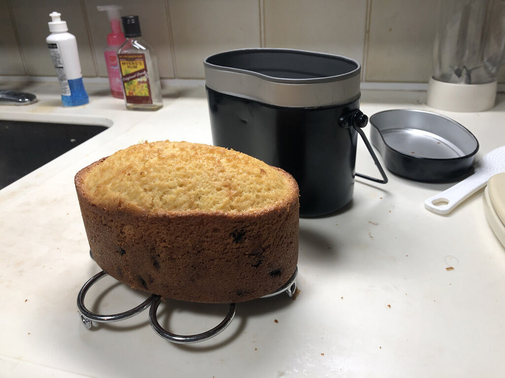 - 焼きあがったら、飯盒からケーキを出して、翌日まで放置します。飯盒に入れっぱなしだと、完全に冷えたあと、ケーキが飯盒から出てこない場合があります。焼きたては柔らかいケーキですが、翌日まで放置して完全に冷ますと、硬いパウンドケーキらしいケーキになります。