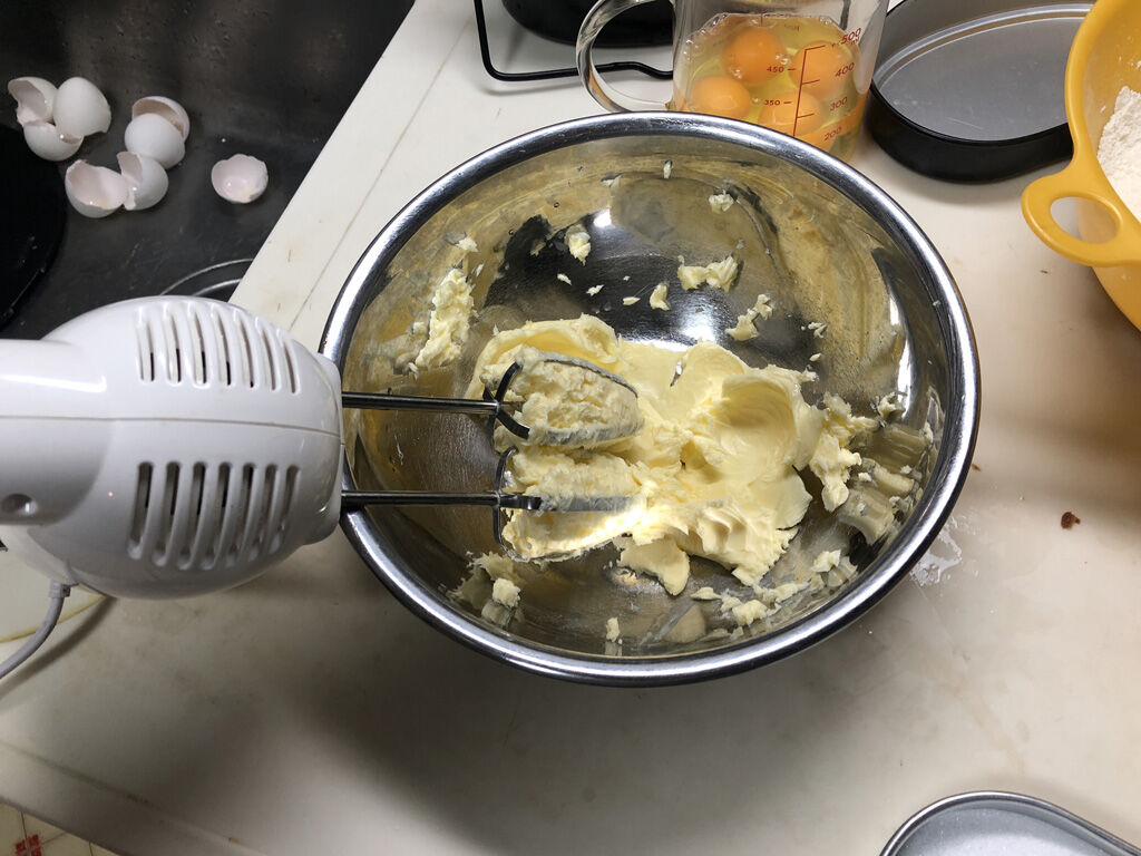 - まず、バターと卵を常温に戻します。冷蔵庫で冷えたままだと、いくらハンドミキサーを使ってもバターをかき混ぜる事が出来ません。また、卵が冷えていると、バターに混ぜる際にバターが固まってしまって、上手く混ぜる事が出来ません。