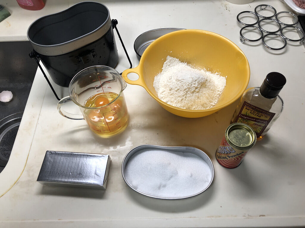 順番は使う順です。どうして200gなのかというと、バターが200gなのでそれに合わせました。300gにしても良いですが、飯盒からはみ出てしまいますし、飯盒からケーキを抜く時に胴体で千切れたり、熱が通り切ってなかったりする事がありますし、その前にそんなに沢山食べれません(爆)