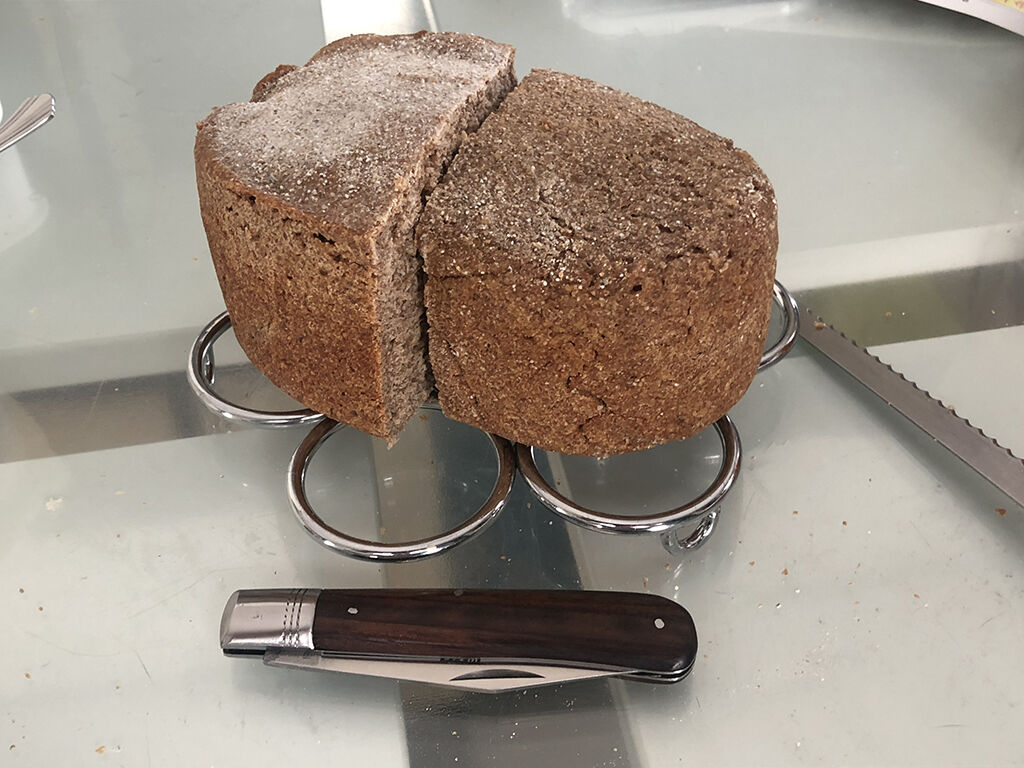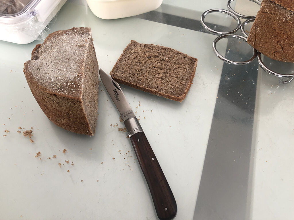 また、ライ麦パンは表面はそれなりに硬いので、引き切りをしようとしてもなかなか刃が立たず、むしろ突き立てた方が良い。パンに突き立ててたあと、引き切る様にしながらナイフを回してパンを切るという感じです。ややこしい文章になる程度に、最初のうちはスパッとはいきません。