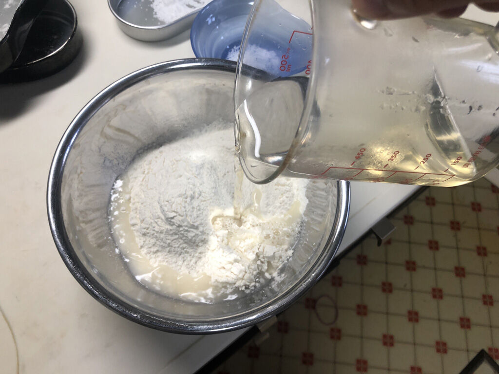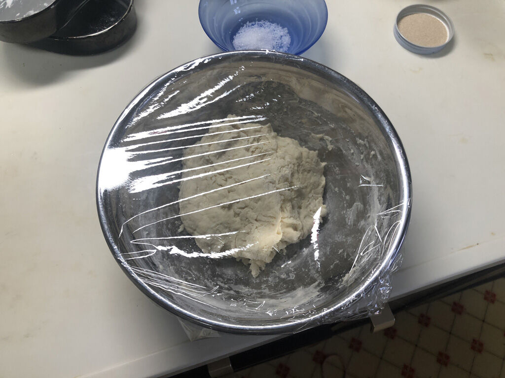 - 35度くらいに温めた水にはちみつを溶き、粉とよく混ぜて、20分休ませる。
