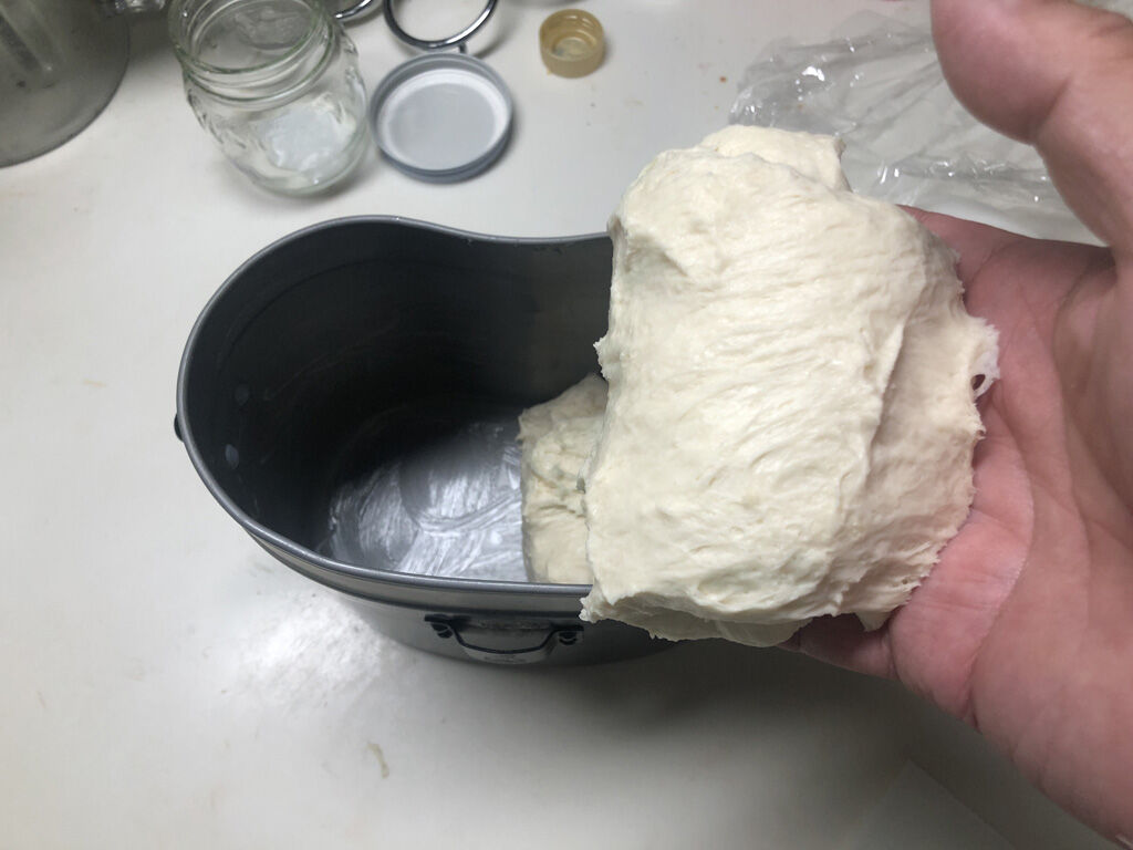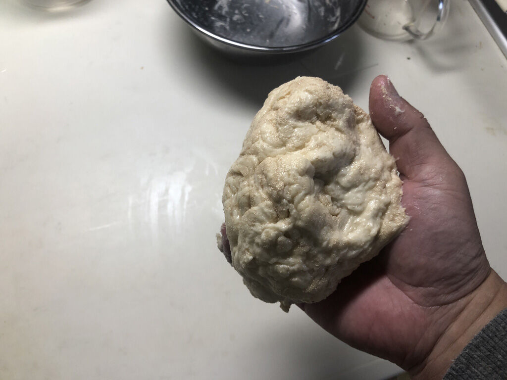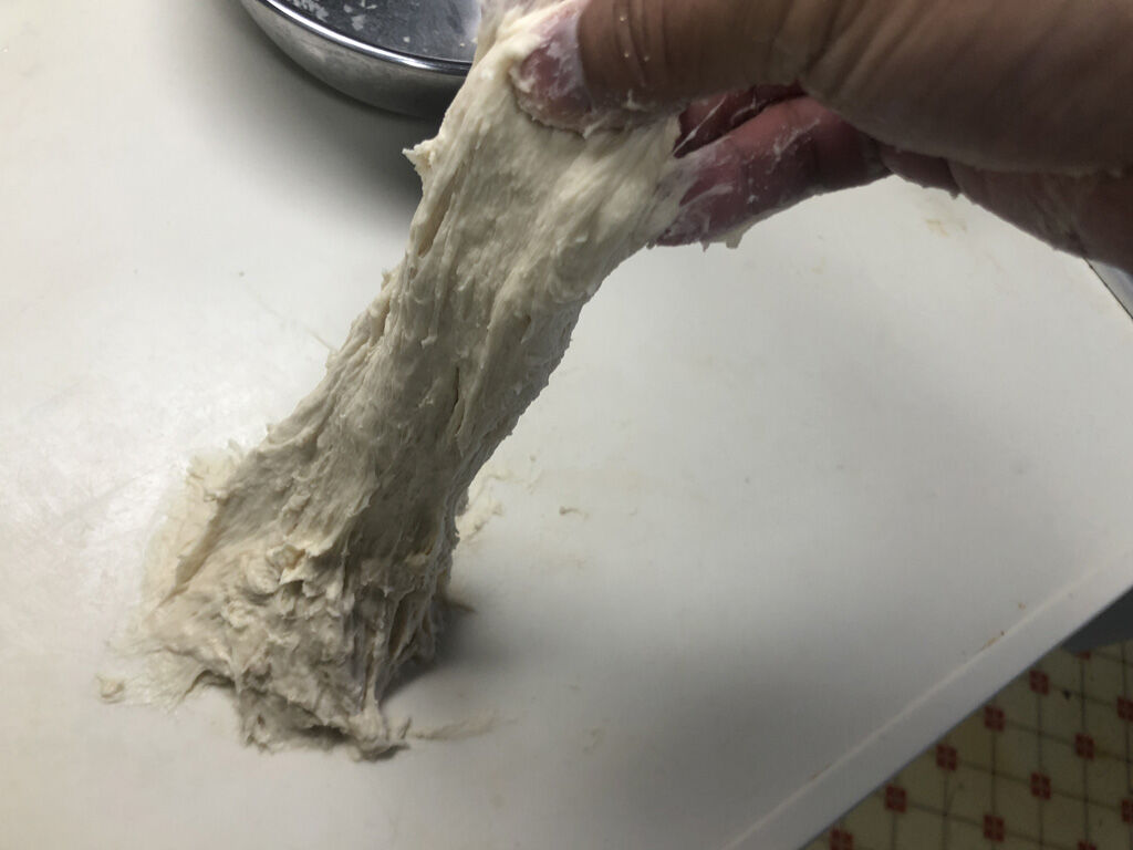生地を20分休ませたら、塩、砂糖、イーストを入れて、生地を捏ねます。見本ではこの時点で結構柔らかく、手にもあまりくっ付かない感じだったのですが、自分がやってみると、確かに板離れは良いものの、手には容赦なくくっつきます。まぁ、普段よりは多少マシという程度で、結構くっつきます。作例では、よく伸びる生地だったのですが、実際には結構硬くて、薄い膜をつくるグルテンテストなんて到底無理。それどころか、最初のうちは砂糖や塩やイーストがなかなか混ざらず、これでもかと捏ね倒してやっと混ざる感じです。