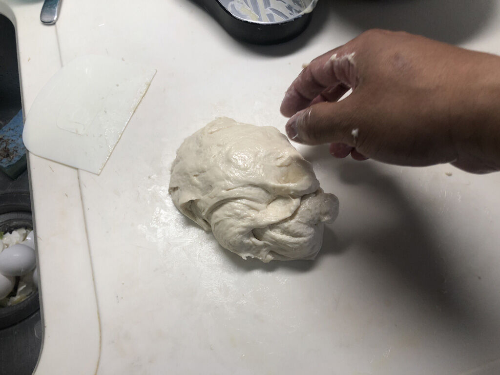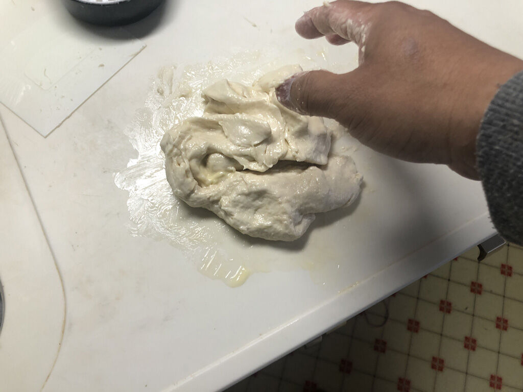 - 板の上で畳んでは伸ばす様に生地を捏ねる。