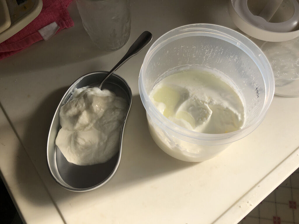 ちょっと半信半疑でやってみたのですが、なんと5時間後、牛乳はプルプルに固まってました。その後、冷蔵庫に入れて一晩冷やすと、ホエイまでしっかり出来た、ちゃんとしたヨーグルトになりました。これはなかなか大したものです。