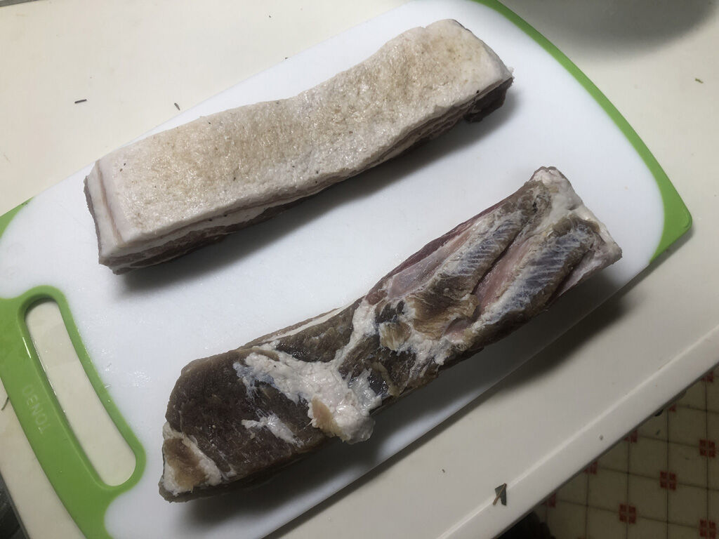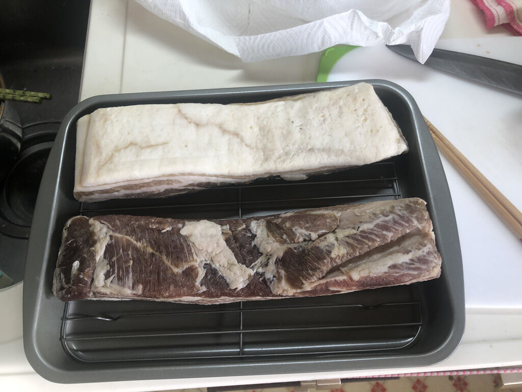 かっきり一週間経ちました。どんな風になっているか、ワクワクしながら出してみると、どっちの肉も赤みの部分が黒ずんで、白い脂肪の部分も青ざめた感じ。うまい事いってるのか不安になりましたが、今さら後戻りも出来ませんし、塩して冷蔵庫に入れてたんだから腐ってる訳がない、と考えて、次の工程に移りました。